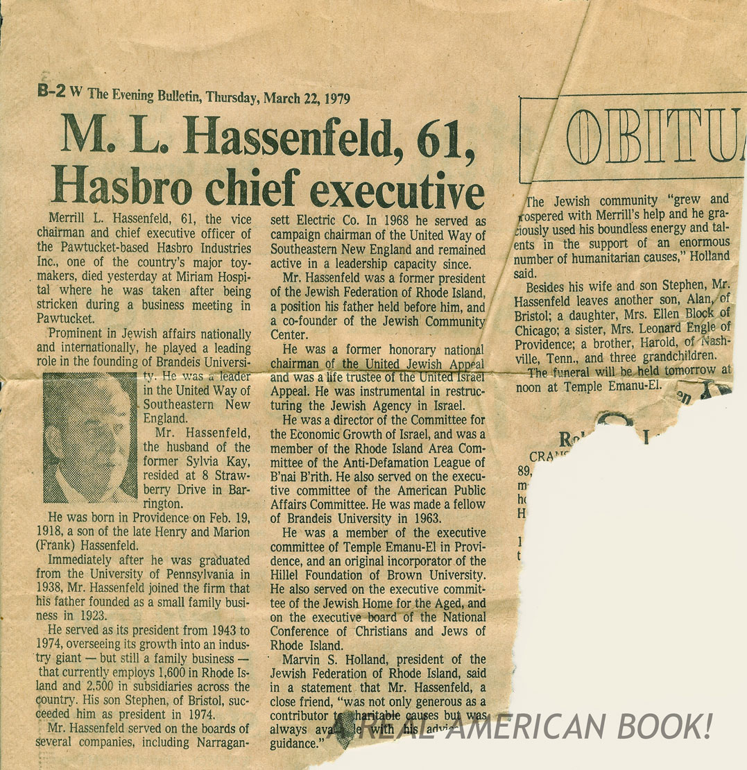 …Merrill Hassenfeld’s obituary from The Evening Bulletin, an afternoon edition of the Providence Journal. Hasbro was a family-owned company for three generations, and Merrill represents the middle of that. He had no direct interaction with A Real American Hero and the 1980s iteration of G.I. Joe, but he approved the original, 1963 Joe. Merrill’s son Stephen learned much from his father while climbing the ranks at Hasbro, and Stephen was president of the company (and heavily involved in A Real American Hero’s development) when G.I. Joe was re-introduced in 1983. Authors John Michlig and G. Wayne Miller both paint interesting portraits of Merrill Hassenfeld in their books GI Joe: The Complete Story of America’s Favorite Man of Action and Toy Wars, and if I could be a time-traveling fly on a wall, I might go to Mr. Hassenfeld’s office circa 1970.