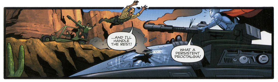Those black and white pages also reminded me of how much I dislike all the color art. An editor once said that some months J. Brown is given just a few days to color a whole issue of G.I. Joe. I have sympathy for inkers, letterers, and colorist who have to make up for writers and pencilers (or editors) that crash deadlines. But what I’ve seen in every single issue of IDW’s Real American Hero series is coloring I completely disagree with. Objects are over-rendered, and most everything is equally oversaturated. Highlights are all over the place, most having no discernible light source. Everything competes with everything else. Color gradients get lighter with white added and darker with black added, which makes for murky, overly dark printing. Everything is colored in isolation, and there’s no sense of color families. The cover offers an example or two. The lens flare on the headlight of the HISS tank is terribly distracting. That’s what I should look at before Duke and Cobra Commander? And the blue and olive hues in the sides of the tank treads — what is that? And the blue in the rocks and cacti on the bottom left. Mr. Brown may know Photoshop, but he doesn’t demonstrate a sense of color theory. But I don’t want to dwell on what I don’t like, set let’s jump (get it?) to two aspects I do: Writing and art.