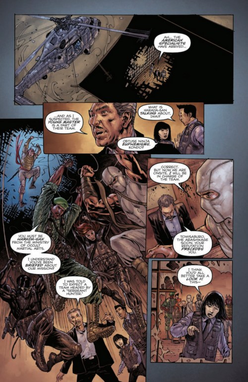 You could argue that Hama, who dialogues over pencil art after providing a plot to his artist, wrote too much dialogue for the fast act of zipping down a line from a helicopter. But I believe that fault lies with the artist, who gave too much real estate to this action. The plot does not want a big, sexy, action shot of five people zipping down into view. This is a panel that acts like a cover, like a splash page: