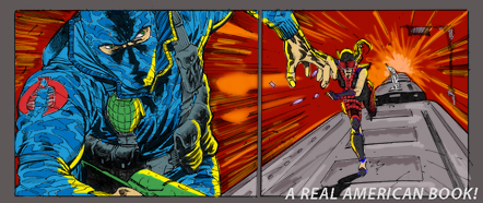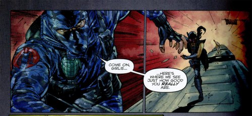 1) Snake-Eyes Sean Collins didn’t do anything. I was hoping that this would be some kind of clash between replacement Snake-Eyes and surprise replacement Snake-Eyes. (Actual Snake-Eyes died in issue #215.) Or that Sean get involved with the chase on the train. Taking down Cobra’s resident saboteur wasn’t Collins’ vendetta, but he was conspicuously on the mission, and he doesn’t do anything. Maybe if the story were longer, which leads me to–