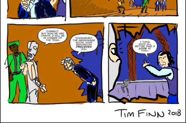 Zartan. It turns out that Budo is actually Zartan in disguise. Zartan is here, the ace in the hole for the mission, so that he can surprise Firefly and remove him from the board. They have a history. This may have worked better under the pencil of a storyteller with more experience than Netho Diaz — I suspect the climactic scene with the dead Soft Master’s sudden appearance and that final tunnel with the low overhang didn’t wow me because of the visual storytelling. I’m trying to reconcile this, that Hama made a smart decision to include Zartan, and his manner of doing so. I suppose the Joes needed to smuggle him into a crime scene (he’s a bad guy!), so he was in disguise as a Joe, one (their resident samurai) who would match with the story. But something about it felt off. For a second I was worried that the Soft Master was actually back from the dead, and appearing out of nowhere. (This sometimes happens in comics, even G.I. Joe.) Then I realized it was Zartan, and then, a month after reading it, I thought that it was a good plot twist.