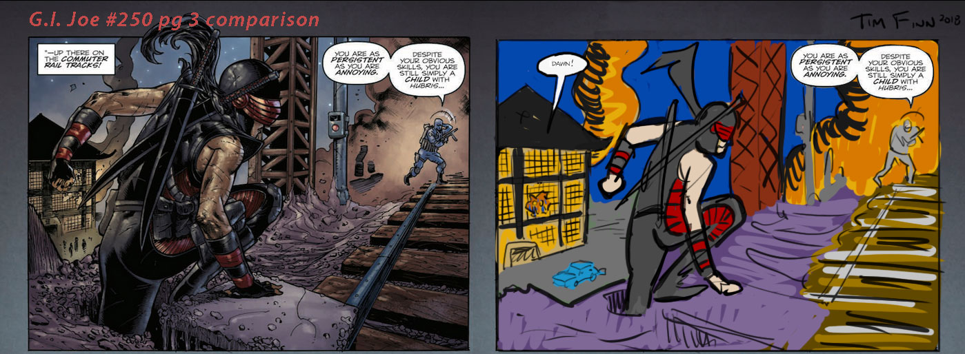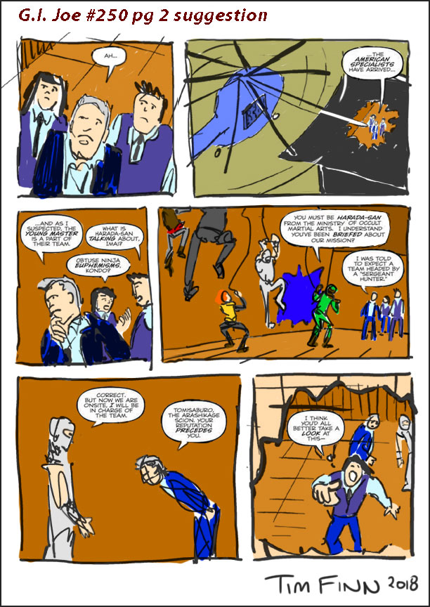 My take could still be improved and clarified. Three problems: One, we don’t see the Joes entering through the hole in the ceiling. We do see them entering, but you might construe that as through a door after landing on the ground outside the building. Two, based on where Storm Shadow and Harada are, we should see that gash in panel 5. It would be behind them. Three, we should also see Stalker in panel 4 since he was walking ahead of Storm Shadow in the previous one. Here’s a revision: