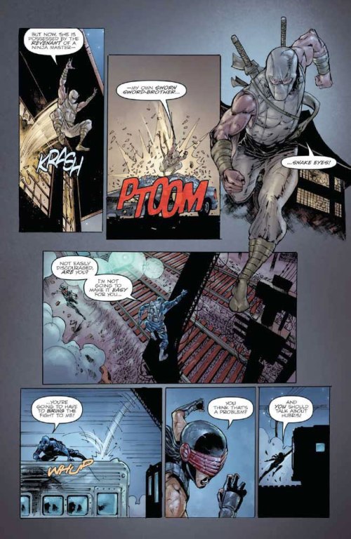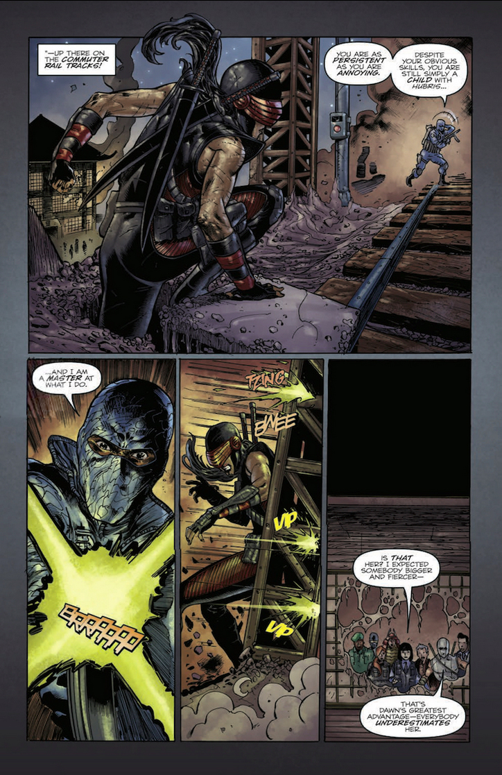 –on the next page, Storm Shadow jumps out of the window in pursuit of Dawn, landing on a car. Where is the car? Was it always there? I don’t know. There’s been no car in this issue. I’m still excited about Netho Diaz’s art, and I don’t want this seemingly nitpicky review to read like a nasty swipe. But drawing is only half the job in comics. Visually telling the story is the other half, and I look forward to Diaz getting stronger there.