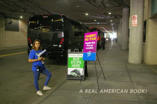 I didn’t catch the nice person’s name, pictured above in blue, but it’s worth pointing out that the entire convention was staffed by Hasbro employee volunteers, either swapping a Friday at the office for a day at the Convention Center, or coming in on the weekend. (Or both?) Every single HASCON staffer was courteous and friendly to a fault. (I asked a few what their job was at Hasbro. One was in sales, I think in New England. She traveled half the time. Another was in Marketing. There’s that well-known toy designer who’s worked on Kenner and Hasbro Star Wars vehicles for 40 years. I saw him in that same blue shirt walking around on Day 2, smiling, and giving people directions in the board game and Beyblade areas.) Here at this minibus two people told us we were going to wait a bit for more people to arrive. I think more Hasbro tours were originally scheduled than necessary, so a few were combined? Or that we were the first tour, and people were arriving a little late because they had to pick up their registration materials before finding the minibus.