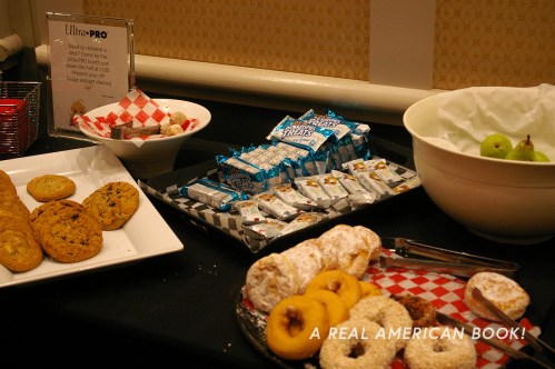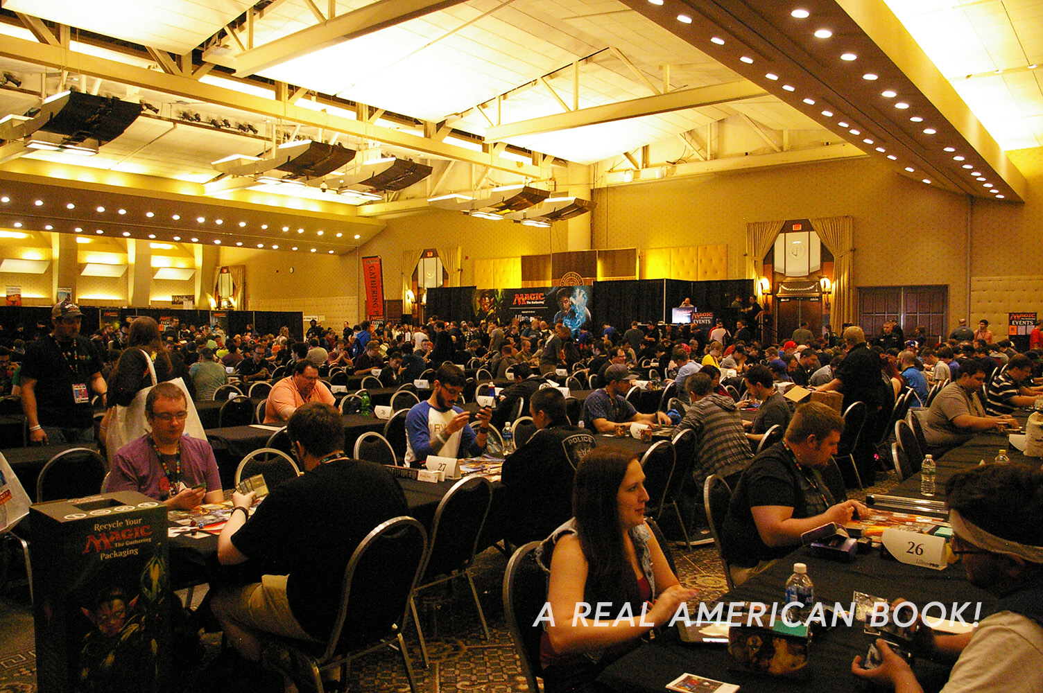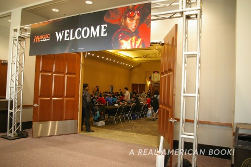 It was almost time for the Joe panels. I bumped into Chris and Kate McLeod and Diana Davis. We quickly checked out the VIP room, where pre-registrants could sit away from the crowds, play games, and eat snacks. Here are people playing Magic: