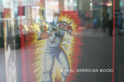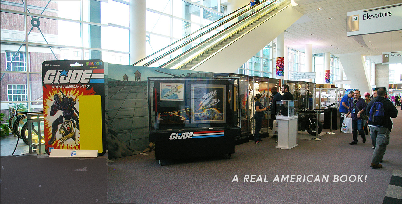 Back on the first floor, finally took a look at the G.I. Joe section. The placement of the G.I. Joe brand area was, at first glance, a telling and damning statement. Rather than inside the main con hall where Transformers and Star Wars and the HASCON boutique (among others) got huge floor displays, G.I. Joe had a modest patch out on the entry atrium. It consisted of five or so glass cases with art, artifacts, and costumes. Later, a friend would suggest that this was actually advantageous, in that everyone — I mean everyone — would have to walk by it to get to the escalators and certain restrooms and snack carts, so you couldn’t miss it. Whereas, by comparison, the phone app and electronic gaming section of HASCON was in a back corner — plenty of space, but not front and center. This is what it looked like (from Friday, sans crowds, so you can actually see it).