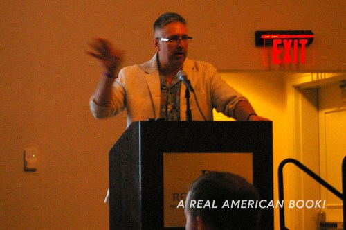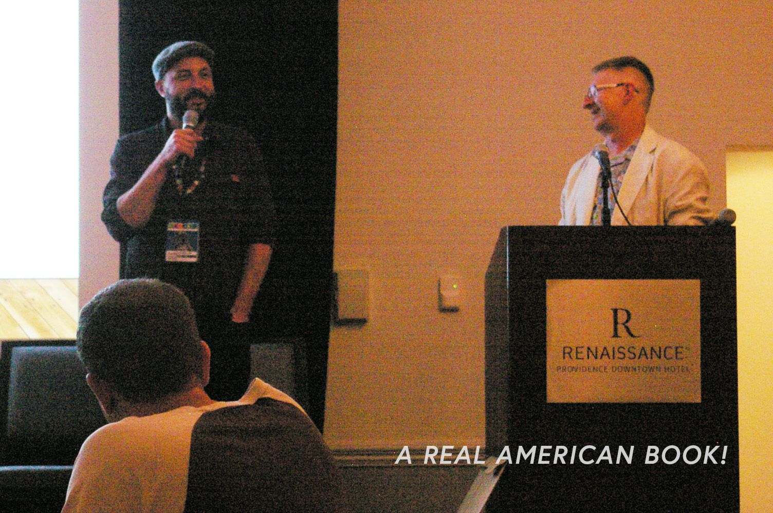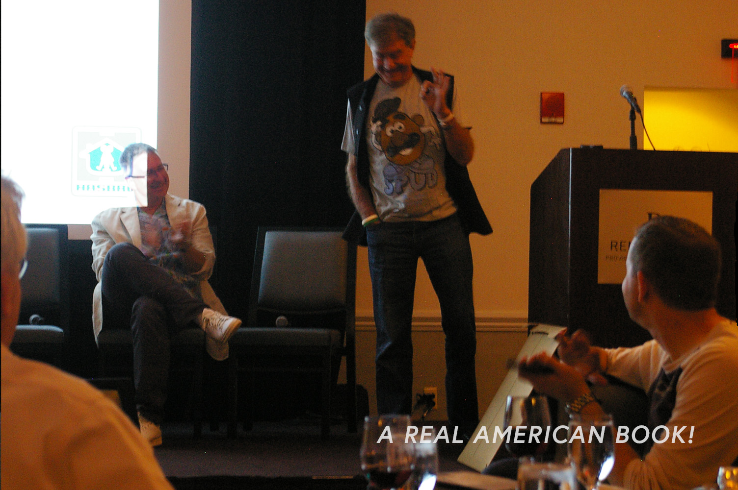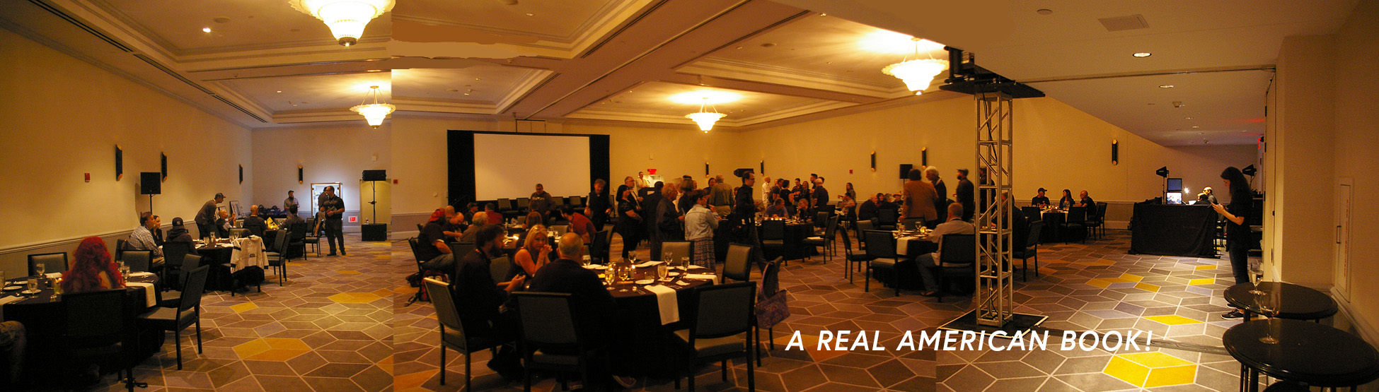 We were in a moderate-sized basement ballroom. Here’s a composite panorama of it. On the left is a table of art and a glass case of 2-ups. In the center was a small stage and the projection screen. On the far right was the bar. I still have my drink tickets, insert ebay joke here.