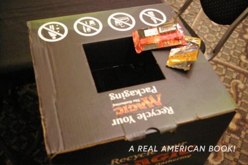 Also, good on you, Hasbro, for encouraging people to recycle. One of these at the end of every row of tables.
