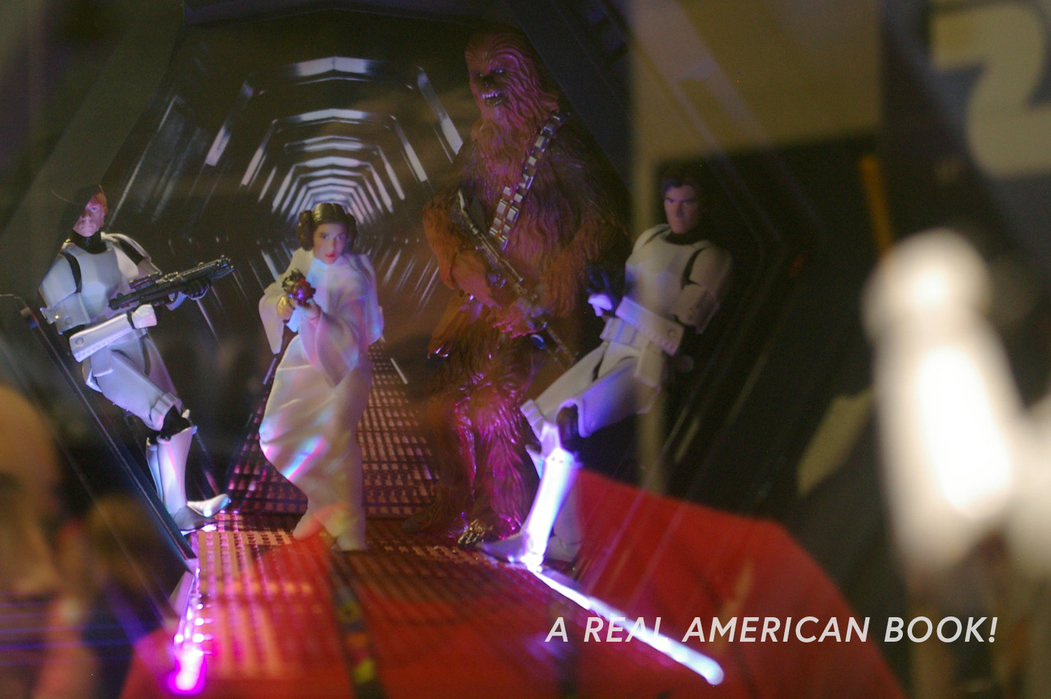 The big dioramas in giant plexiglas cases were fun to look at. So many people were photographing them and taping them with their camera phones it was sometimes hard to spend a relaxed minute taking in all the scenes and marveling at the fun construction. What with the glare, I knew I wasn’t going to get great shots, so I didn’t try. But I did like this bit of exaggerated depth from A New Hope in the Star Wars display.