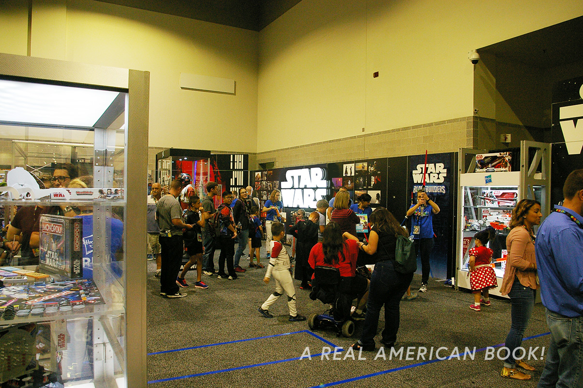 (Little known fact! Before I was writing a G.I. Joe history book, I was also researching a Transformers history book! That’s partly why I attended BotCon for 12 years. I know a little about the gents pictured above, but again, I was here with my metaphorical G.I. Joe “Press” hat on, so Transformers would need to be an afterthought.) Contiguous to the Transformers area was the Star Wars area (photos below), and then the HASCON Boutique. This was where fans who are used to brand-specific shows like BotCon and JoeCon might feel put out, that HASCON was not about dealers selling old toys to collectors. In this retail area, Hasbro was selling new product to us. The prices were a little high, and (once again) there really wasn’t anything G.I. Joe to speak of, so I wasn’t interested. Please note, while the Friday photo here looks deserted, this space was full of people buying toys on Saturday!