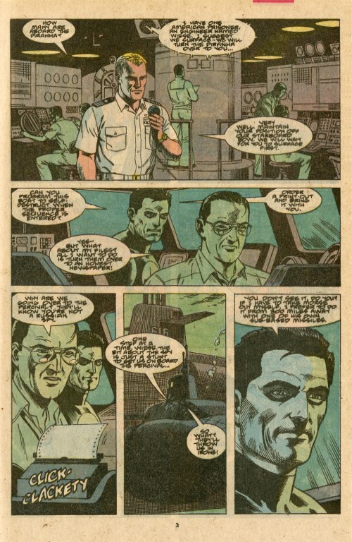 Wagner, coming from the Joe Kubert school (and the Larry Hama school) of torsion and cinematic, movie-like panel compositions, offers a lovely compliment for Heath, who utterly takes over. As a comic book reader, I missed all that work that made Heath well-known — the war comics for DC and such. But Heath was popping up in interesting places around 1990. Over writer Mike Baron’s great scripts, he drew a few issues of The Punisher that my brother and I certainly liked —