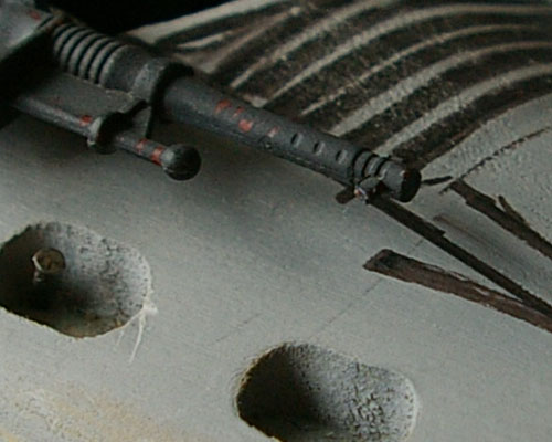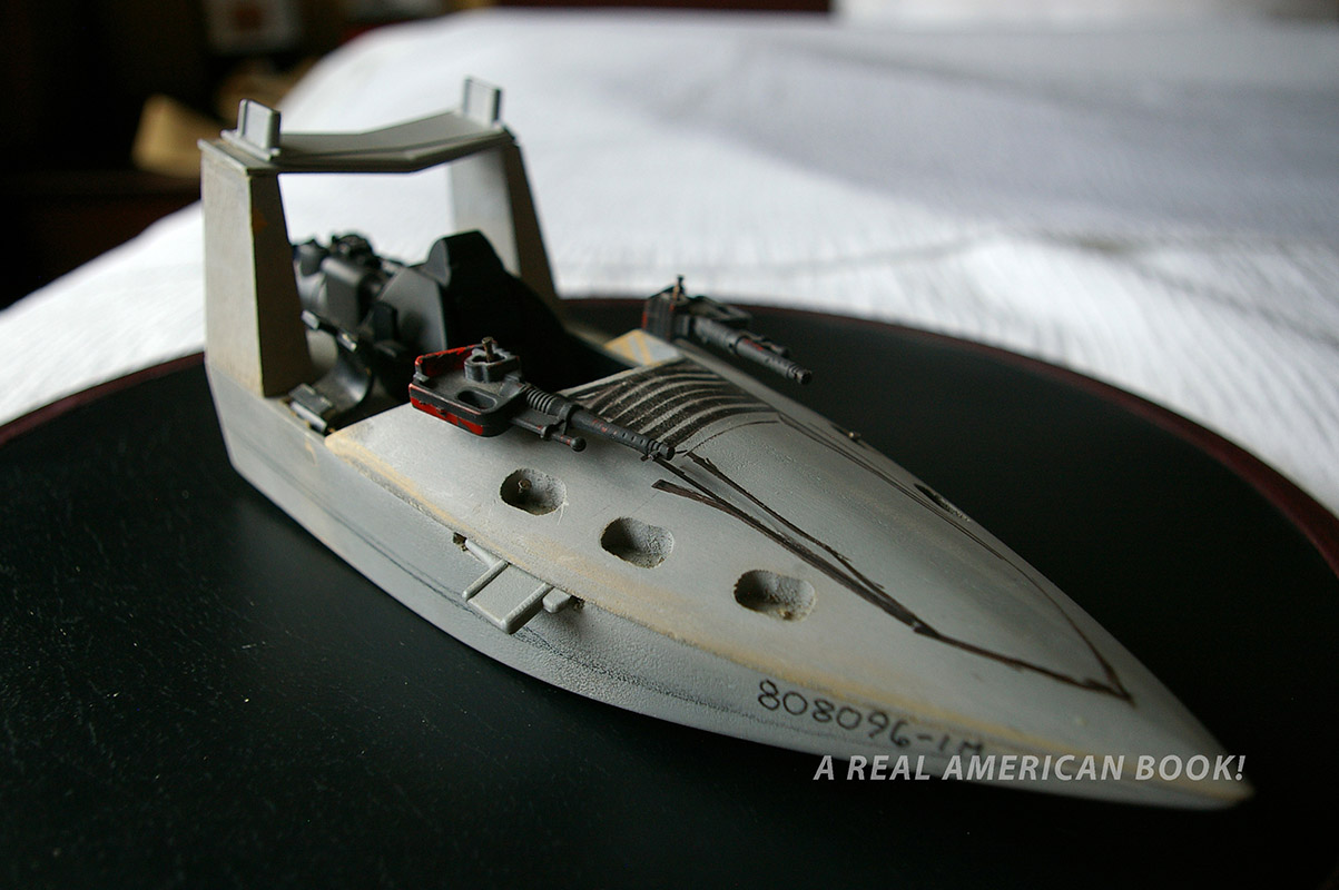 Kunitz designed the Cobra Piranha, sketching it out and drawing schematics. He likely built this grey model, as for many years vehicle designers both created their tanks and planes and boats on paper and then also in three dimensions. But later in the span of Real American Hero, the division of labor changed a bit and the models were built by employees in the model shop, a separate office in Hasbro. (Engineers handled the final steps in either case.)