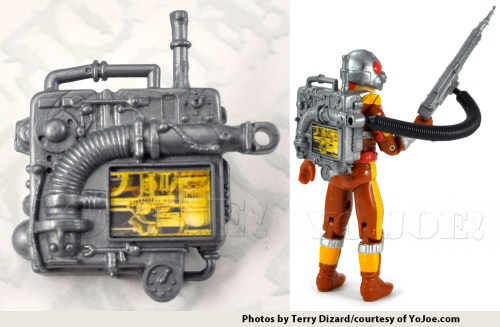Around 1986, ’87, and ’88, Hasbro was experimenting with lenticular printing on a few stickers (the B.A.T. chest plate and Lightfoot’s tiny robot), and one arrived on Charbroil’s backpack as well. Such objects feature a kind of animation, where an image shows movement across a few frames (like a flipbook with only three or four pictures) or in this case, a simulated 3-D imagery. As you wiggle the backpack back and forth, there’s depth to those yellow pipes, canisters, and circuits over that black void. They seem to slide a little to the left or right in parallax, as if they were real bits deeper inside that backpack.
