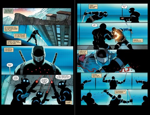 Colorist Blee doesn’t help by making Tripwire’s green so similar to Snake-Eyes’ grey. I don’t need bright green for the guy wearing green and deep black for the guy in black, and the lighting in this scene does properly dull out the colors, but throw a guy a bone, click to enlarge: