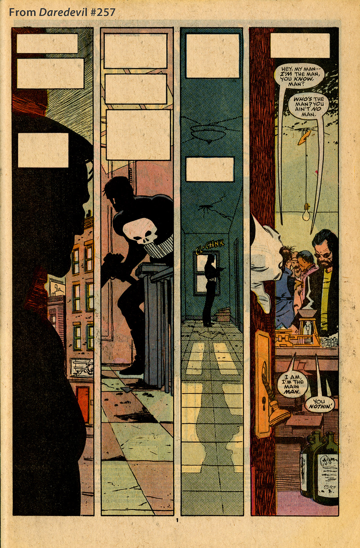 Geez, what a dramatic scene of people just talking in a hallway! Notice how JRJR establishes the building and its windows in panel 1. Then we see light coming through those windows or analogous skylights in panel 2 to show (not state — the Punisher doesn’t say “Now I’m inside the building) that the Punisher is now inside that building. His size changes from panels 1 to 3 — big, medium, small. Panel 3 reinforces the window both as an object to frame this bold silhouette, and also as a source for the Punisher’s shadow. And then the Punisher is barely in the final panel, but his hand connects him to the space and us back to him. And again, we see the door in 3, and we definitely see it in 4. This builds tension and anticipation. Boy, are we sure excited to see the Punisher blow away these bad guys on the next page! (And that’s exactly what happens.)