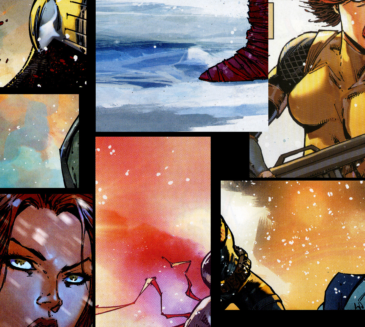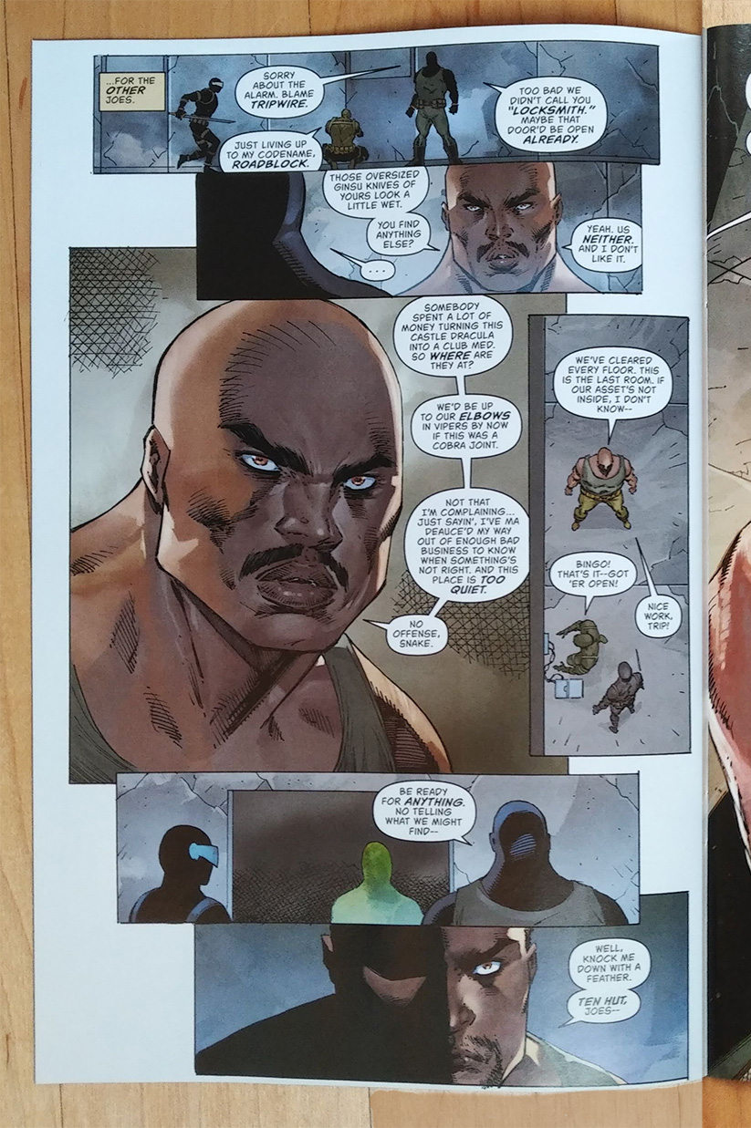 Colorist Blee doesn’t help by making Tripwire’s green so similar to Snake-Eyes’ grey. I don’t need bright green for the guy wearing green and deep black for the guy in black, and the lighting in this scene does properly dull out the colors, but throw a guy a bone, click to enlarge: