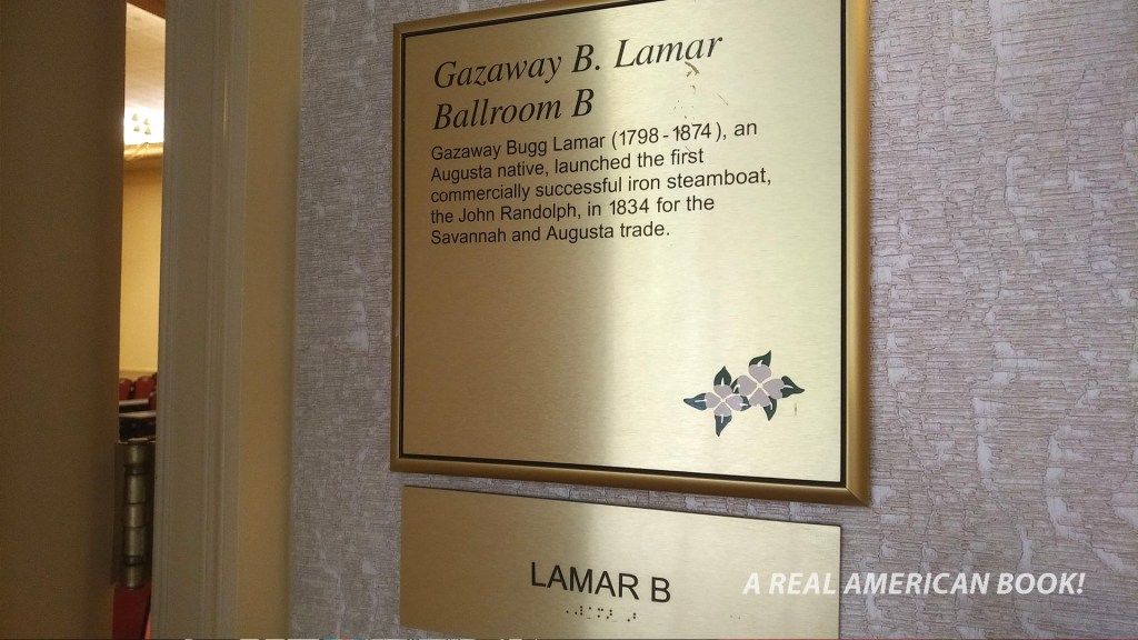 In fact, one of the challenges of a convention weekend is eating. (And drinking water!) You might bring snack food, or forget. You might plan on eating at the hotel restaurant, but there may be a wait as dozens of con-goers get out of the dealer room and head there. You might make plans to eat with friends, but twenty or thirty minutes can quickly pass as you wait for the whole group to form up, or more people join, or there’s no plan for where to eat, or walking there just takes time. It was 5pm, and the con hall was now closed. It was time to make a decision. I had been inside all day, was desperately hungry, and couldn’t wait around to find friends to get a meal. I also, having eaten two dinners and two breakfasts so far at the hotel bar/restaurant, wanted something else, and didn’t mind something local to downtown Augusta. In fact, a change of pace, away from the con, and requiring a few minutes outside would be welcome. Doing something like this solo, without friends when long-distance friend time at a convention is so precious, felt like I was breaking some unwritten rule. But I was having a food emergency and planned to be back fast.