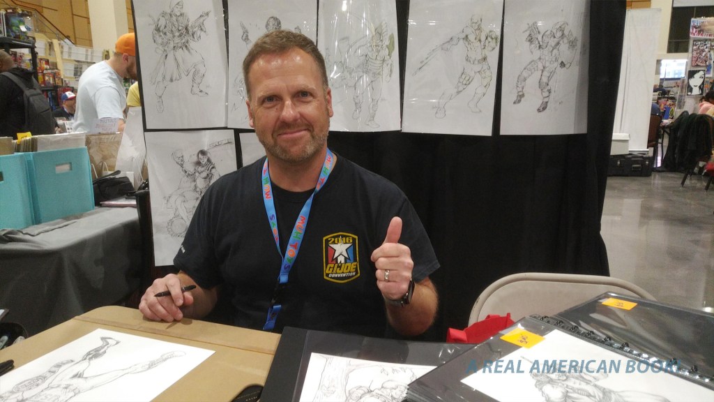 Across them Pennington and Riches was John Earl, who I’d only met online. A few years back I created a version of the social media art challenge called Inktober, but instead of one black and white drawing each day in the 10th month of the year, I drew a G.I. Joe villain each day. In November. In color. It was called Cobrember, and Earl accepted the unstated challenge, drawing 31 Cobras as well. It had been a good art exercise, so he wanted to say hello, and I’m happy to say he has drawn several months’ worth of Joe characters since then.