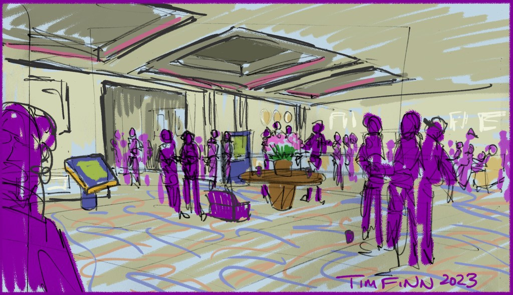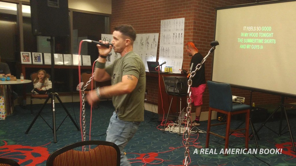 In this open-ended time of looking for people or something specific to do, I realized how tired I was from going to sleep late and waking up early, so I found a chair in an out of the way hallway and half-dozed for 20 minutes while people walked by. This was around 7pm! Montanarella didn’t text — that’s fine, conventions are fluid and you never know who you’ll bump into or what you’ll see that swallows up 40 minutes. I went back to the hotel upper lobby and bumped into Ritz Murphy, who I met in Des Moines at Assembly Required, where he gave me his R&B album on compact disc. He was also interested in karaoke. He also did a back and forth search of the upper hallways and small panel rooms and couldn’t figure out where or when karaoke was, until we did.