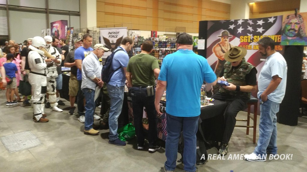 Here’s a photo of a long line for Slaughter photos and selfies from a little later. Note that the Sarge is signing a G.I. Joe Classified figure of himself. More on that below.