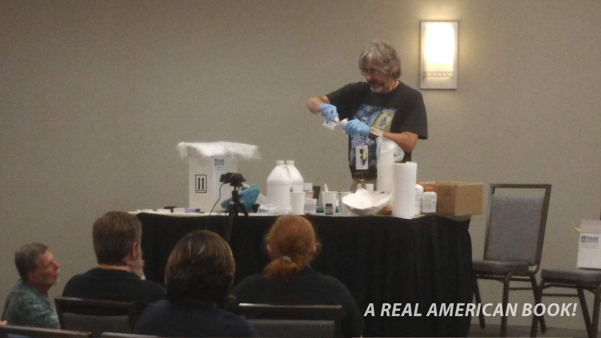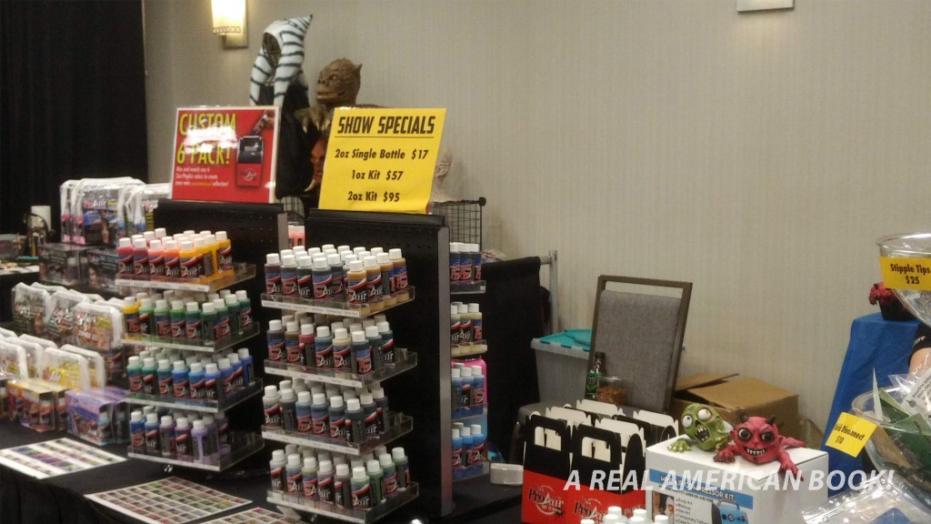 In his panel, Ashby explained about his small run custom costumes and accessories, and the things he’s learned in mixing ingredients, and how they set. Here are two shots from his dealer table, later on.