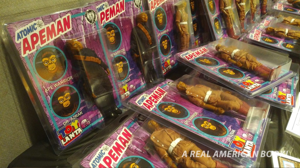 In walking back and forth from the con room to the elevators all day, I kept passing the registration area. And there I saw the two-figure Atomic Apeman packs, exclusives from ToyLanta 2023 several months earlier. I was impressed that this small show, JoeLanta, had an exclusive, even if shared with or left over from its larger sister show. And I was also tickled that such an exclusive straddled a line — they could fit in with the Mego Planet of the Apes line, but also (I think?) the 12-inch Joes. The costumes looked good, and the logo had a retro, pulpy feel.