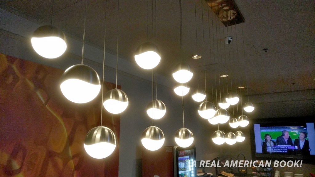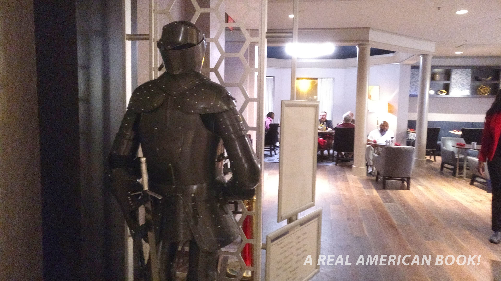 Got dinner solo at the hotel restaurant. Oh, now I understand the weird Las Vegas imagery on the elevator doors — if the hotel is called the Castle on the Hill, and Excalibur is pictured on the middle elevator, and there’s this…