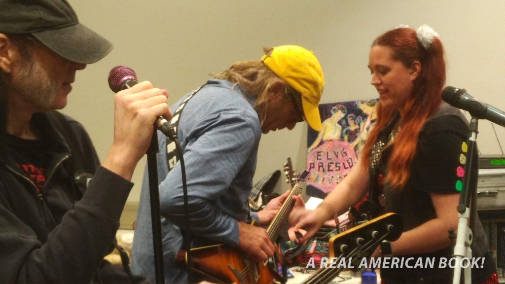 And they were great. More on Radio Cult (that’s the band) in Part Three! They did a Black Sabbath song, and then… Korn…?, and “Seven Nation Army.” Then they stopped and explained that they don’t take themselves too seriously, and for their next song wanted to invite someone from the audience to come up and play guitar with them, someone who’d never played guitar. No volunteer immediately raised a hand, and the band explained that this was all in good fun, and this next song would definitely be easy, even for someone not musical. Ace Allgood, who with his long hair and alliterative name one might assume is already in a band (but he later told me he’s not), raised his hand and got a big applause. The band spent a minute explaining the simple count and what two hand positions Allgood needed, and then they all performed Nirvana’s “Molly’s Lips.”