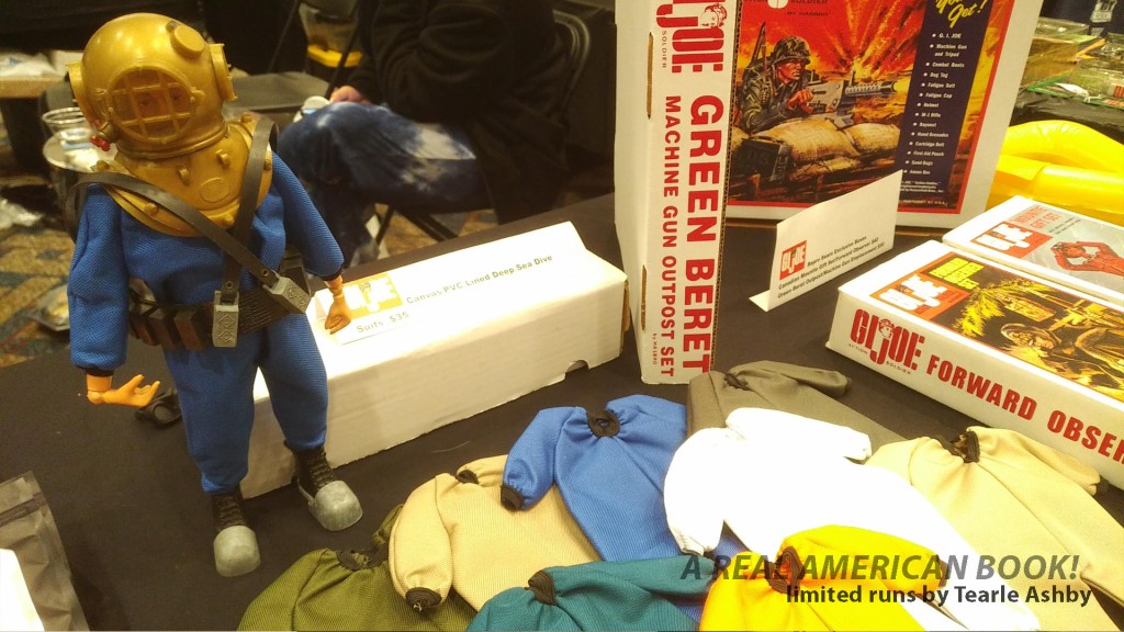 As background, what I gathered from chatting with Ashby later, was that in the early ’90s his pal got a hold of a set of original GI Joe molds and Ashby created forms from them. The original Hasbro GI Joe wetsuits from the ’60s are a pure rubber, vulcanized, which deteriorate over time. Ashby’s new recreations are a latex blend, so they last. With the vintage 12-inch Diver, the original costume was canvas with rubber lining. The intention was that kids really played with it, diving the figure into pools or ponds, but over time the lining dried up and now turns to dust. Ashby’s new take on this is a canvas suit with a PVC lining.