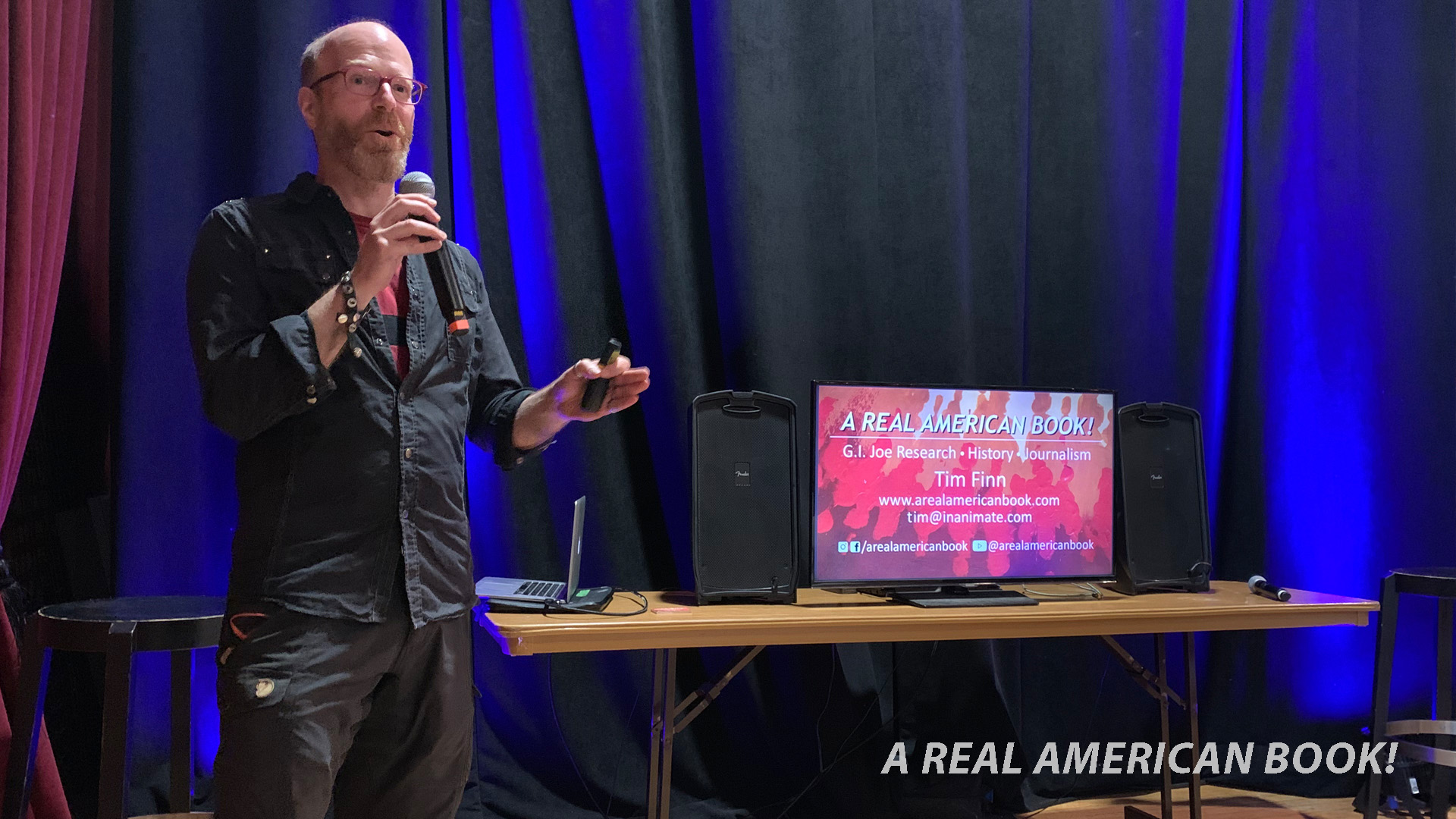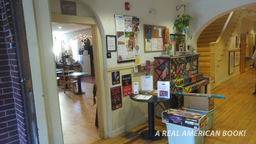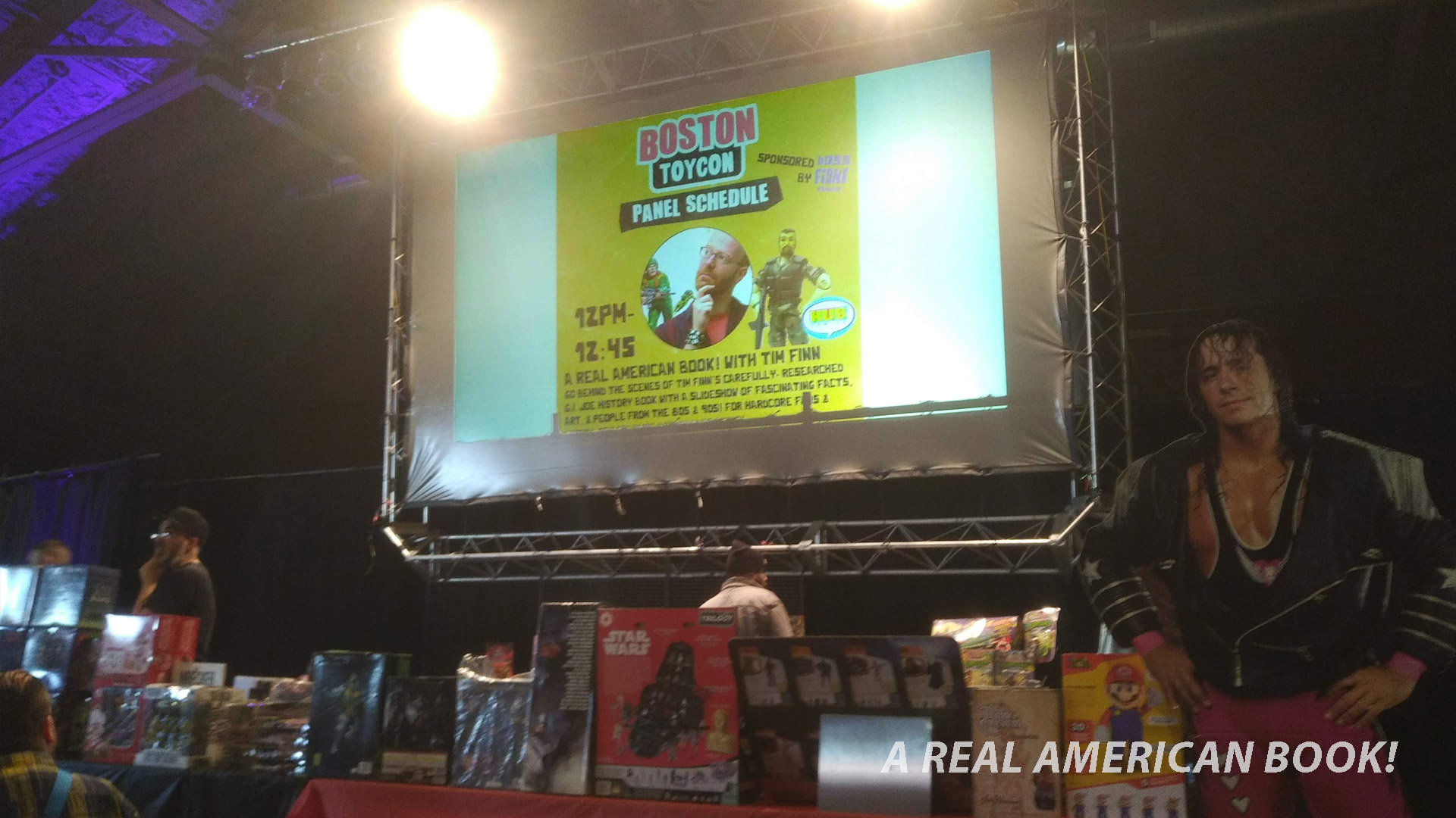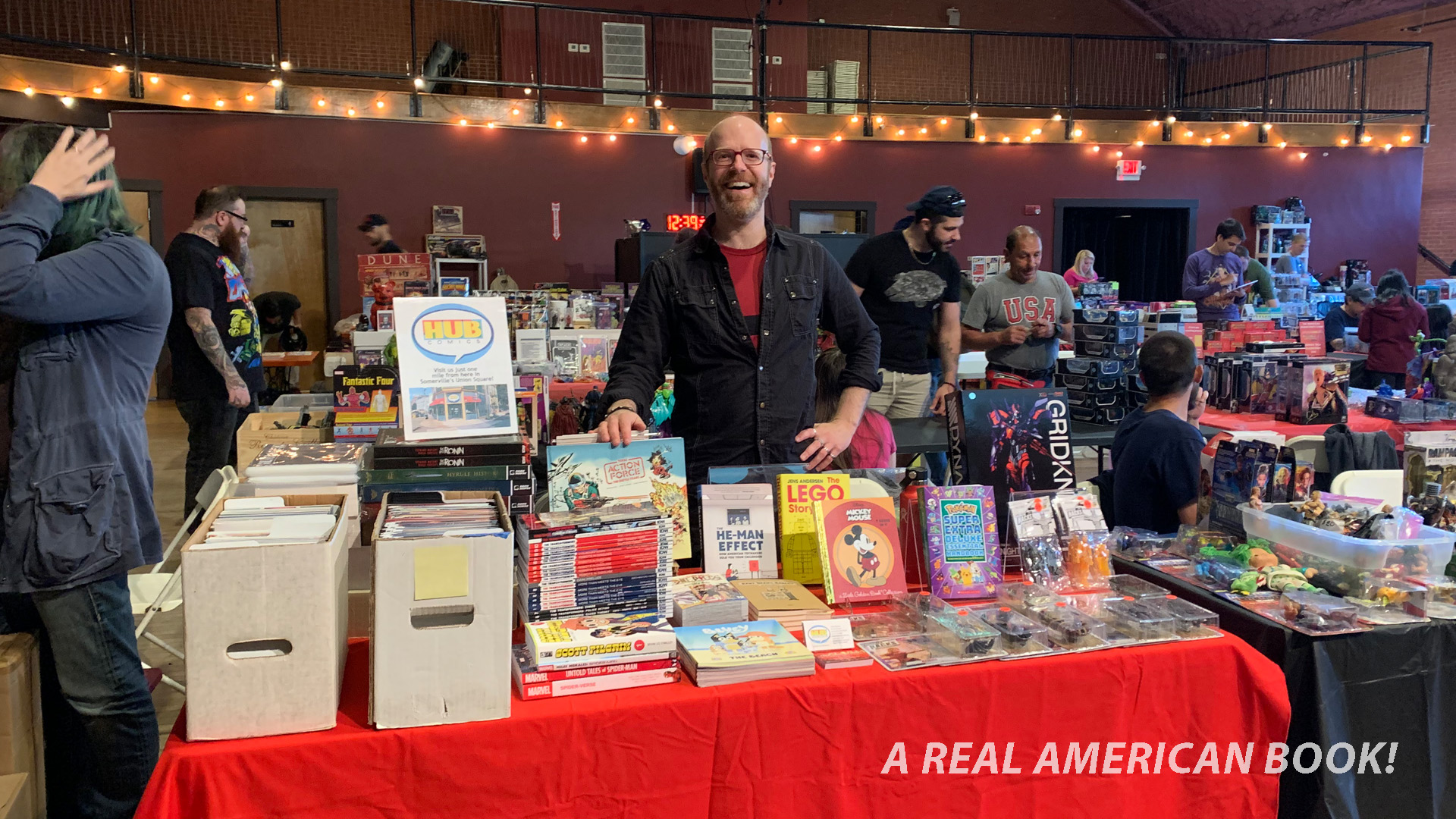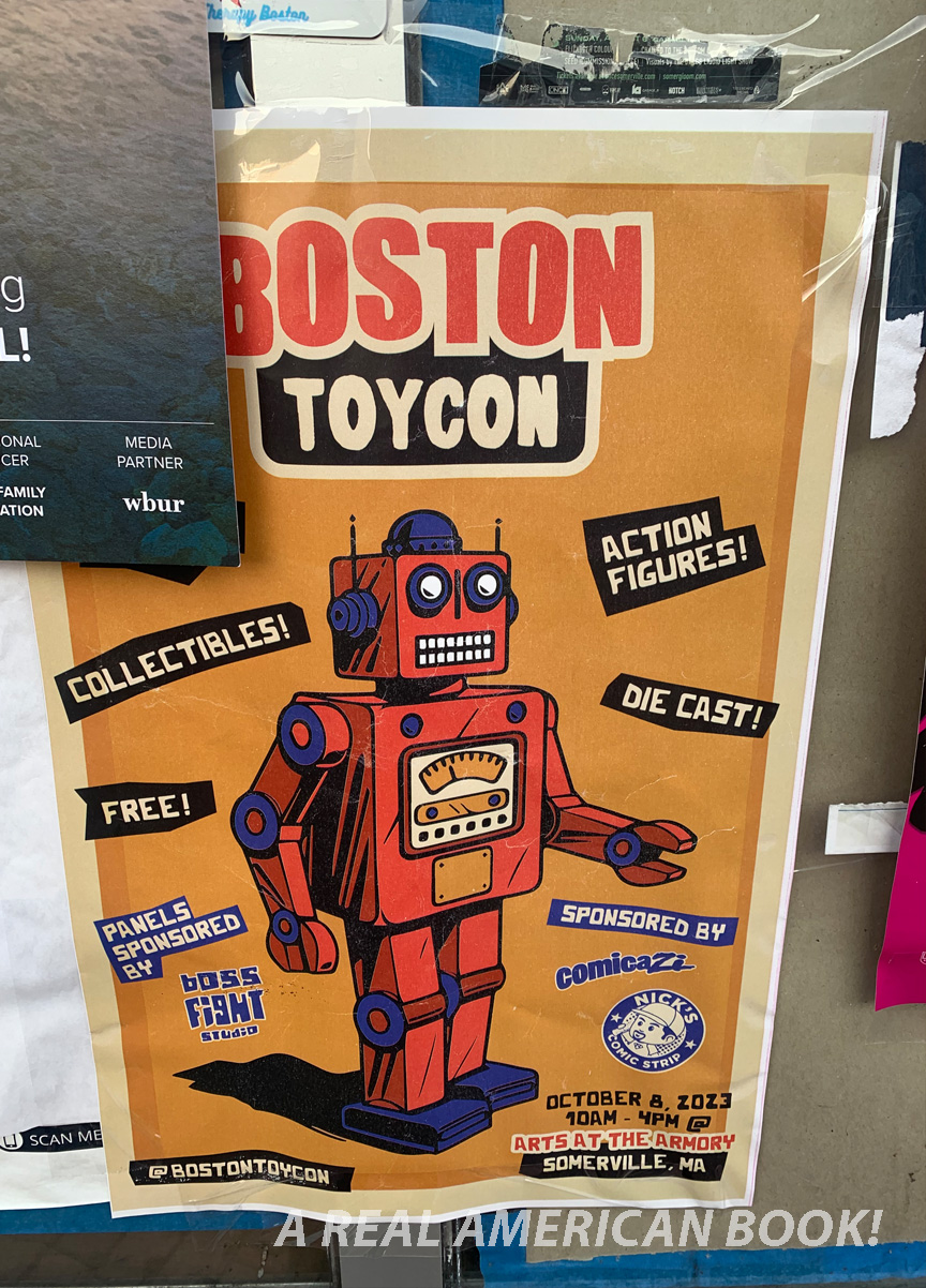 Boston TOYCON was a success. I would have liked attendance to be a little higher, but for a first show, it was a great start. We did sell some books, and that combined with the normal Sunday business Hub Comics did at actual Hub Comics, it made for a nice tally. More importantly than books for sale, this was a good kick in the pants to make an A Real American Book!-focused slideshow. And it wasn’t about teaching, or my shop, or making comics, or too much about the writing process. This was mostly about the book itself. And now I’ve got that handy, and ready to customize with more or different slides as needed, should the opportunity present itself at some other convention, talk, or presentation. Again, a tip of the hat to Comicazi Bob for co-organizing the event and inviting me, and particularly for the opportunity to talk about my book, and to my wife for slideshow critique and table-hanging-out. Should the calendar allow it, if there’s another Boston TOYCON next year I’d be inclined to go.