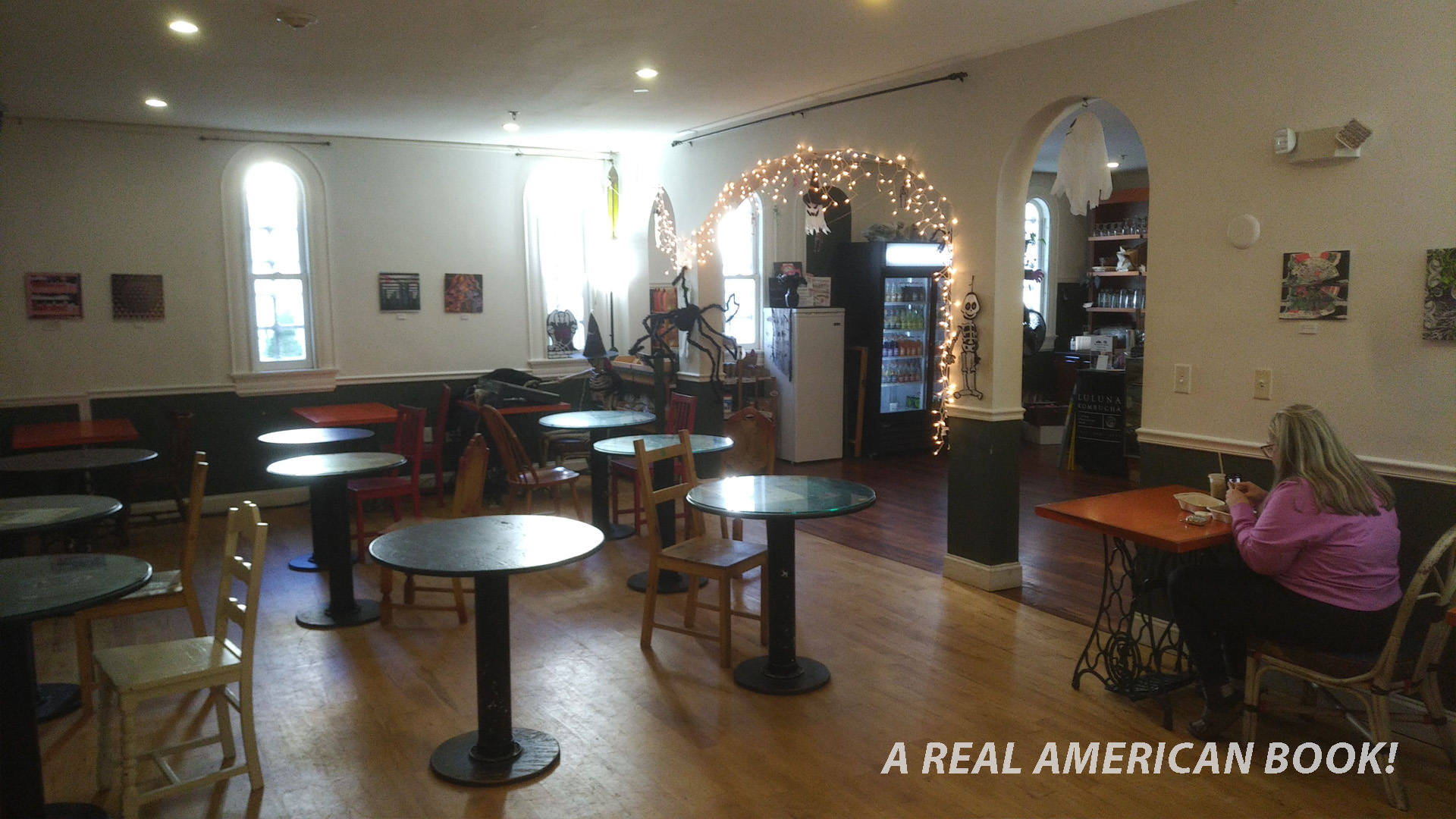 Three photos. The cafe entrance, inside the cafe, and then straight ahead to the main hall entrance: