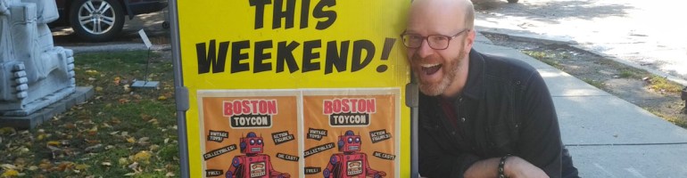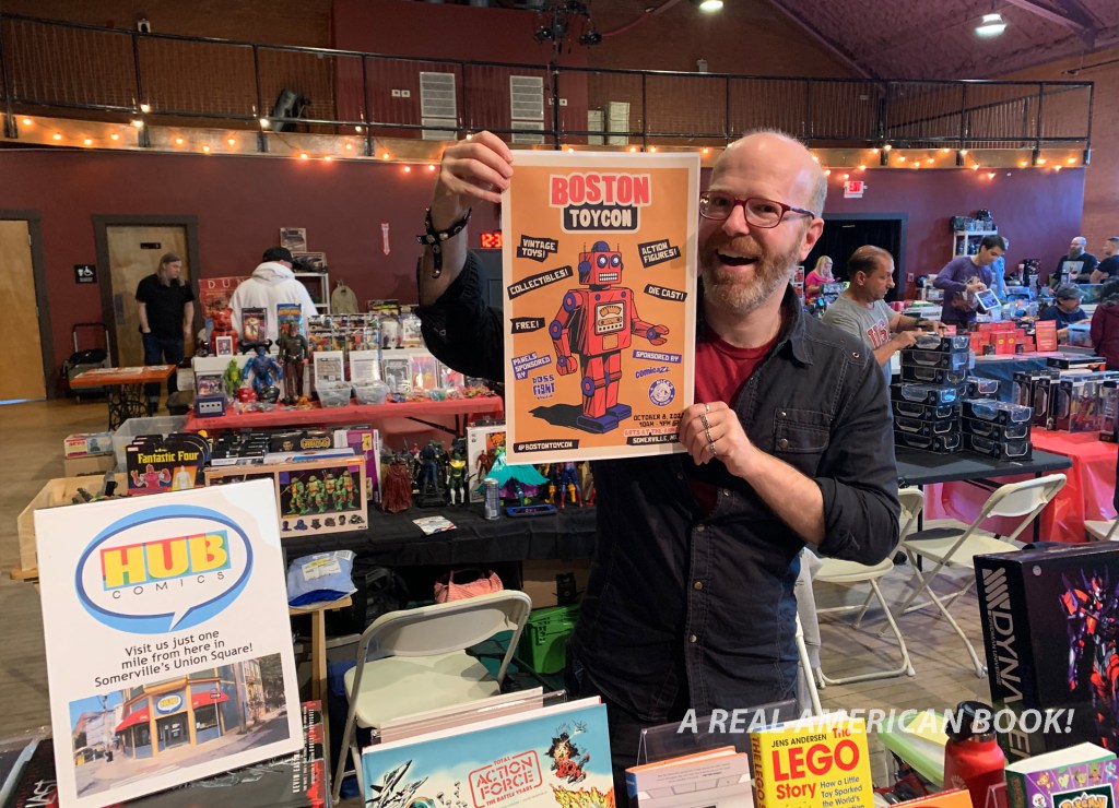 I try to be at my shop for part of each weekend, but travel for family or work can preclude that. Representing my store I do exhibit at two small comic book conventions each year, which means not being at my shop, but I’m certainly doing shop work. And they are notably near the shop — no long drive to unload at a hotel in the suburbs. As the convention season in and around Boston feels pretty stable, it was a surprise when Comicazi Bob, co-owner of Comicazi, the other comic book shop in Somerville, Massachusetts, invited me to table at a brand new con. But it wasn’t a comic book show, this was a toy show! My shop doesn’t sell toys! Well, sort of.