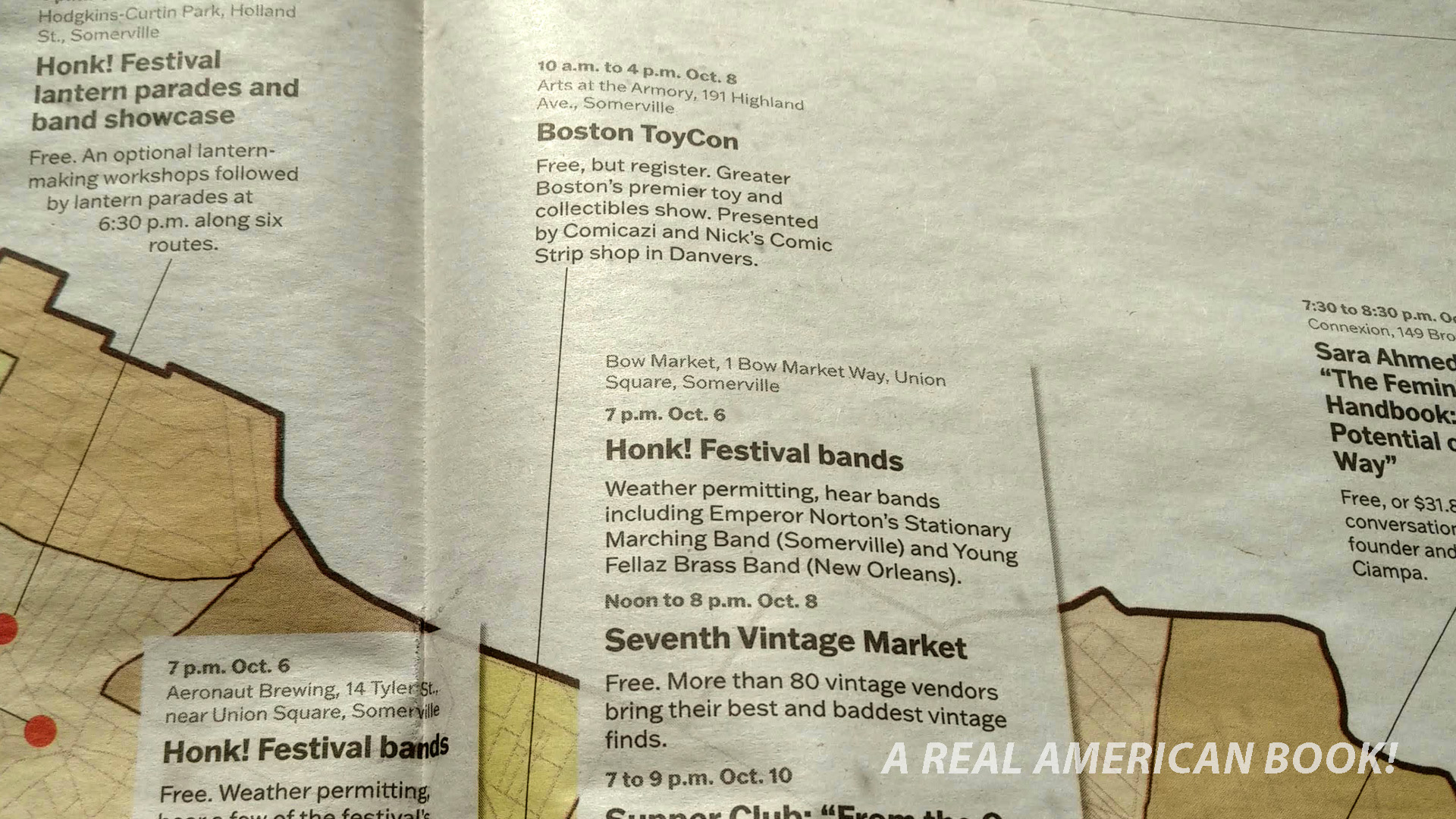 A few days later, in The Week, published by Cambridge Day, I saw this, and chuckled. Every issue, at its centerfold, has a map of Somerville and Cambridge with call outs for cultural events.
