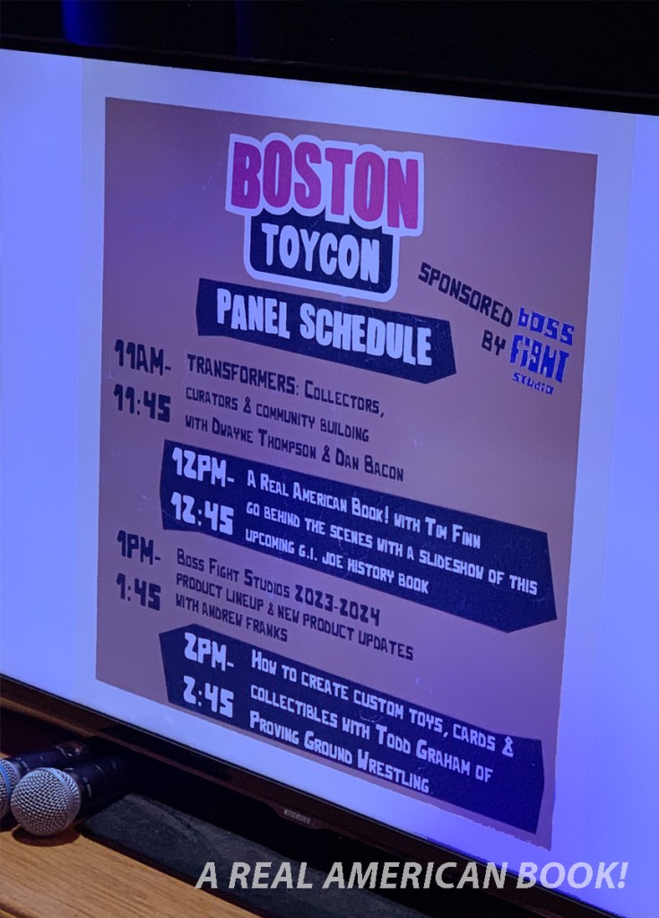 There was an hour to sell before the first panel, which was about Transformers collecting and community building. My panel started at noon, and having practiced it twice the night before, once that morning, and also I’m a teacher and standing in front of people does not make me nervous, I was prepared. I had a good joke ready for my “no pictures” request, which you’ll just have to see in person if you ever make it to a panel of mine. A longtime pal who’s not into toys, but does have a LEGO-enthusiast partner, showed up, which was lovely. We live near each other, but don’t see each other often. So: spouse in audience, check; close friend in audience, check. Some Joe fans took their seats. Comicazi Bob did as well, which I appreciated. He knows only a smidge about my book, mostly that I’ve been working on it forever, but he’s also an armchair Mego historian. It felt nice that my panel was enough of a draw that he could step away from co-running a show for 45 minutes. Here’s a photo my wife took: