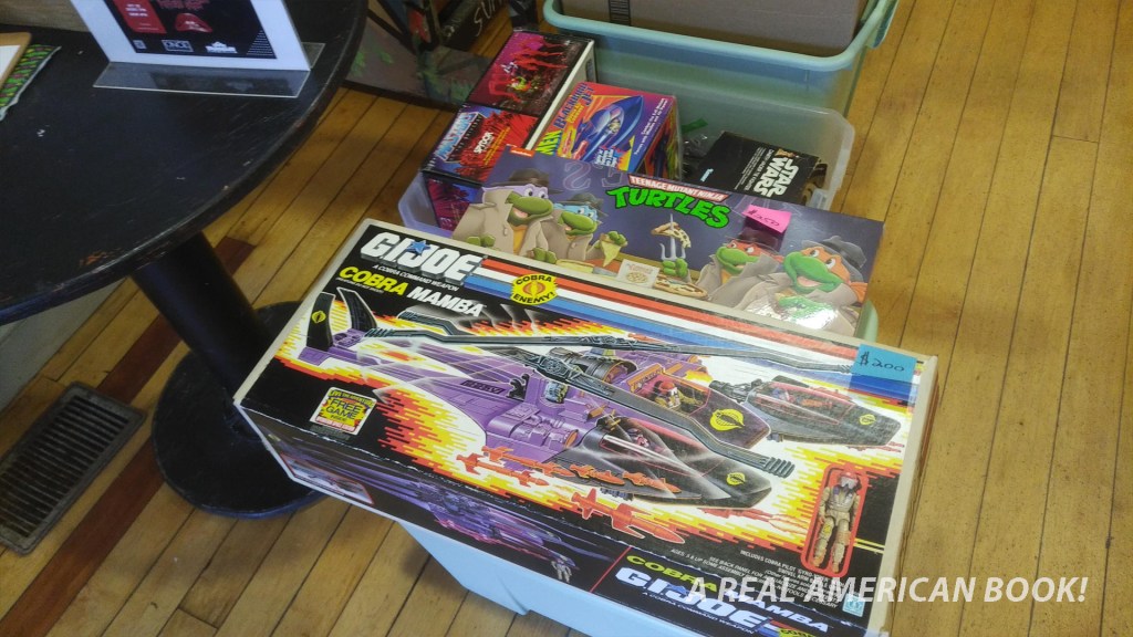 Back at my table, I was hoping people would notice for sale the final 80 (not a typo) issues of IDW’s Larry Hama-written Real American Hero, that people not quite aware of my shop and its great selection would find these sought-after comics. Aren’t there readers looking forward to Skybound’s issue #301, aiming to complete their runs, who fell behind, who want to know about Dawn Moreno and the casino on Cobra Island? Yes, yes there are, but I didn’t see many during this particular afternoon stretch. Also part of my counter programming, every issue of the great Furman/Wildman/Guidi Transformers: ReGeneration One. Not many takers, but again, we sold a bunch of Spider-Man and Bluey books, so I’m not complaining. Well, I mean, yes, I am complaining, G.I. Joe comics fans, where were you? Well, it’s okay — maybe I would bring some to Assembly Required a month later. (Present tense update: I did attend Assembly Required one month later and you can read about it here very soon.)