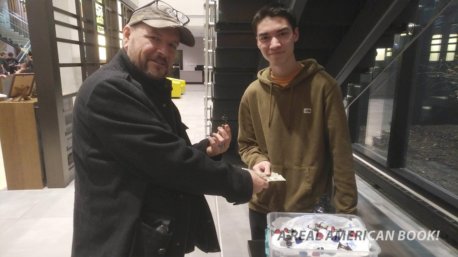 We didn’t finish, but after a slow two hours of learning the rules, we got to a good stopping point and called it. Back in the lobby, Chris Murray put a deposit on some custom-painted Mission Critical miniatures from Alex Bainter, and I caught the hand-off.