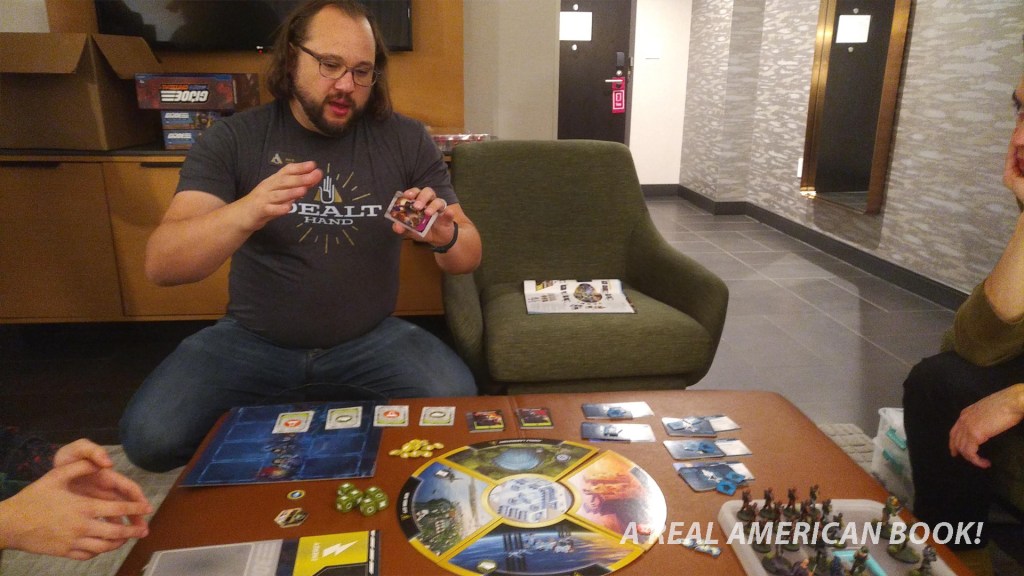 Up on the fourth floor, con organizers had an extra room available, and so ten of us assembled there. Joe R. of The Dealt Hand, a two-person company that hosts gaming events around Iowa, brought with him two of Renegade Game Studio’s G.I. Joe games: the miniatures/card game Mission Critical and the Deck-Building Game. I wanted to play the latter, because that’s something I can try solo at home, but I still need helping learning the rules. However, I did back the Mission Critical Kickstarter, and got everything in the mail, so I’m interested in that. But I still haven’t opened the box because I’m still learning the Deck-Building Game!