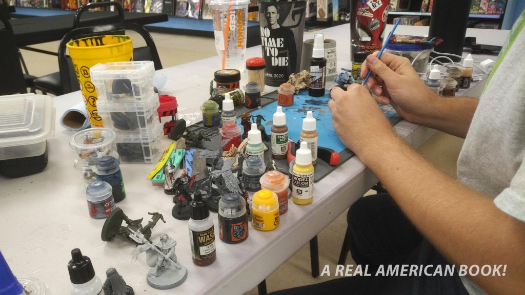 Here is a photo not from Assembly Required, but from a comic book and gaming shop my wife and I visited this past July, where a gentleman was painting miniatures. This can act as a stand-in photo for Alex Bainter, who is a talented painter of gaming figures!