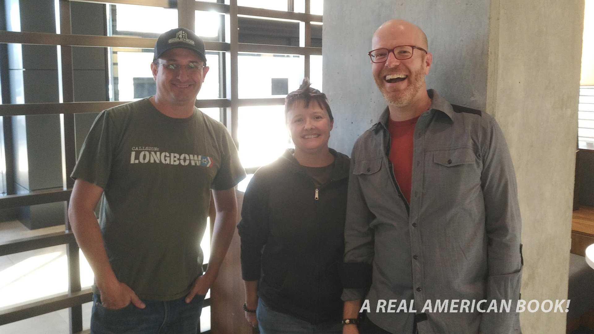 Headed to my hotel room. On Facebook, AR co-organizer Travis Webber posted that the few early arrivals could gather in the lobby at 3pm for fun activities. I’ve never gotten to a con this early, and anyway the previous year I kept to myself the first half day to walk around. After a little exercise, I got tasty potato soup at the lobby bar, but didn’t see anyone showing up for 3 o’clock. Oh, wait, was that Troy McKie way across the lobby? Why yes, yes it was, plus Troy’s wife, Leena McKie. Troy informed me that the gathering time was in fact 3:30. We chatted about his Joe collection, the cabinet G.I. Joe arcade game (they own one) and Callsign: Longbow action figures. Here’s Troy, Leena, and myself.