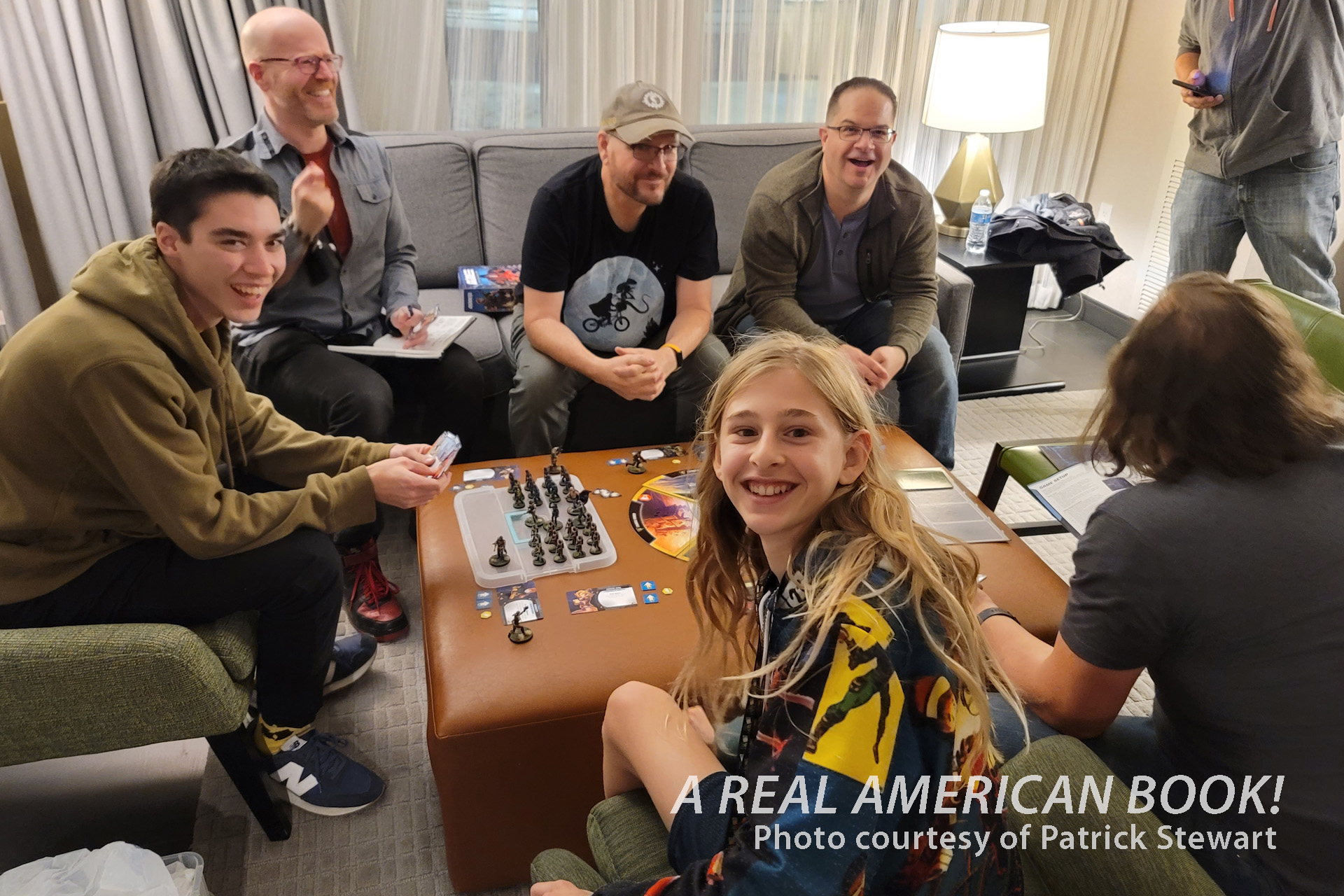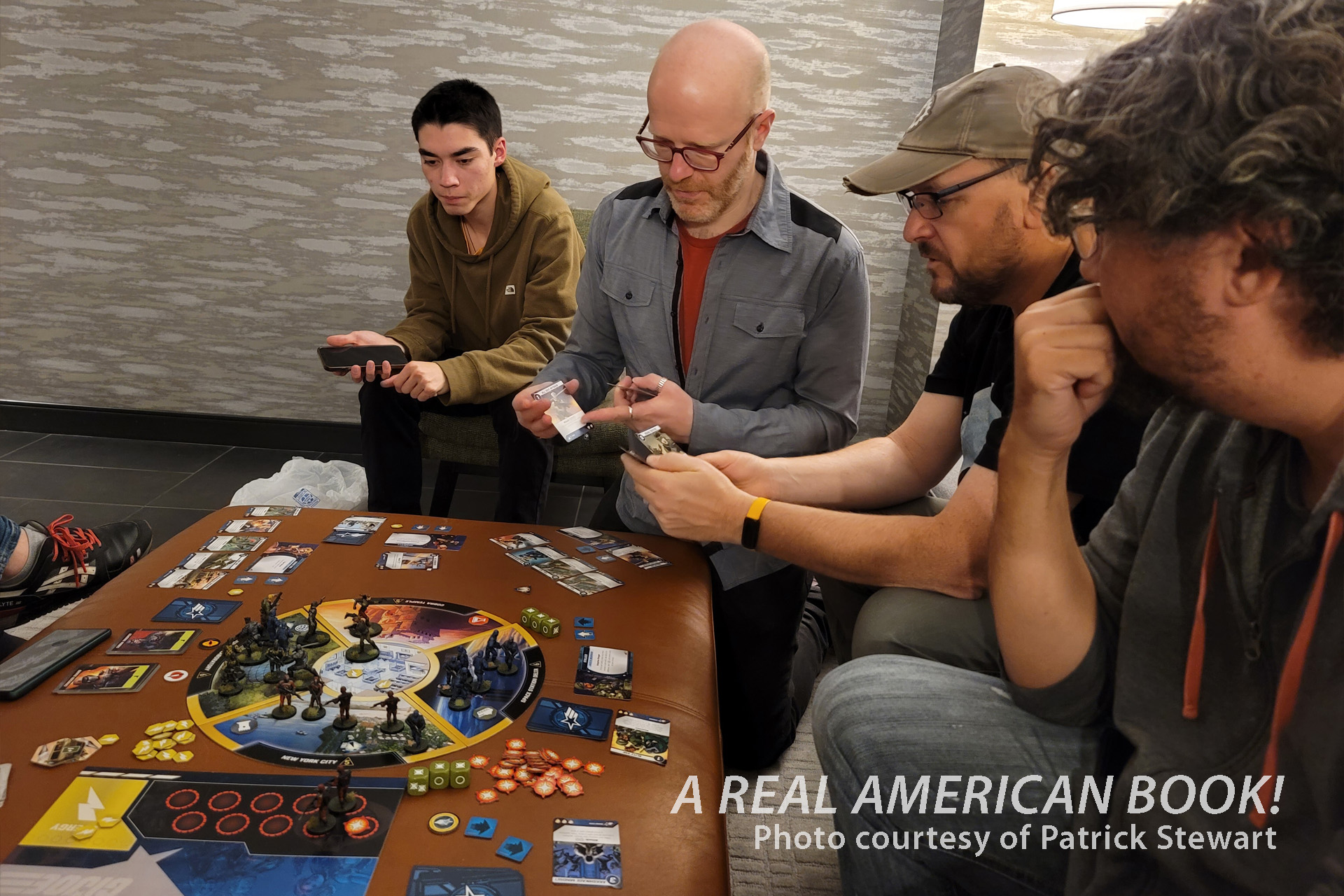 Wagner dropped me off at the hotel, and he departed. The comics/toy/pizza/barcade excursion had returned. There was now a proper gaggle of 10 or 15 people chatting in the lobby/lobby bar. The AR organizers had, a few weeks earlier, floated the idea on Facebook that the first night could have a gaming get-together, and I was all for this. But first, I saw Mark TalkingJoe in person for the first time! Fun fact: Mark is taller than I thought, and in fact, I think taller than me. (My starting point had been only seeing him on a monitor, and always sitting.) Earlier, I had suggested to him that he might skip the airport shuttle and hitch a ride with con/internet pal Josh Eggebeen, who’d driven in from California, but was heading to the airport to collect Hawk Sanders. It’s more fun to get picked up by a friendly face (Eggebeen was on an episode of Talking Joe a few months back and Mark is a fan of After Action Report, which Eggebeen co-edits and Hawk Sanders co-publishes.) In fact, Eggebeen, Sanders, and Mark headed straight from the airport to the pizza barcade, so Mark, after a long flight from London, before even getting to check in at the hotel, was already taking part in Joe-fan socializing! And in all of this meeting and greeting, there’s still some post-pandemic relief that live events returned and we can travel, so seeing a person in-person is great. Just great.