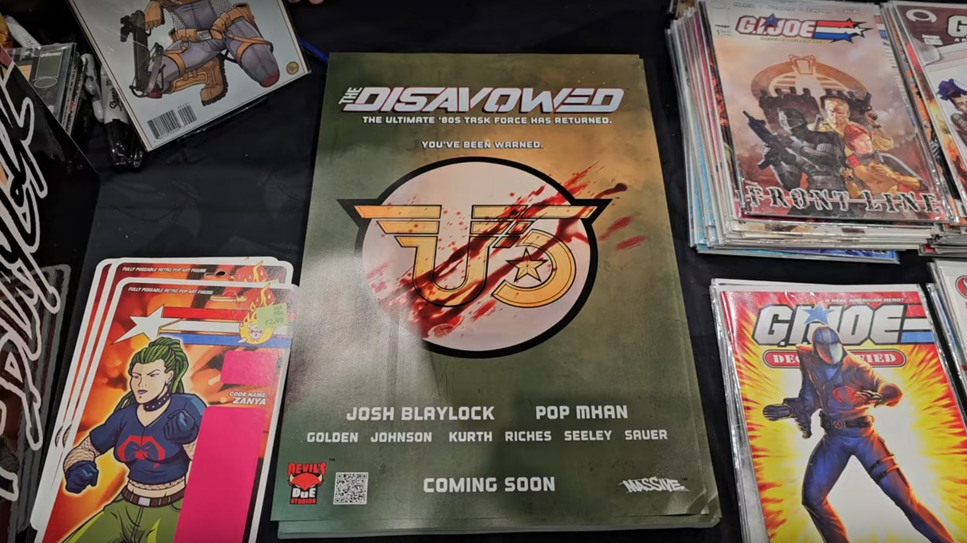The next booth over belonged to Carson Mataxis. It was split between his two major projects, one of which was his super fun and successful Operation: Recall toy line. This is another of those action figures that aren’t 1980s G.I. Joe but could be, and Mataxis cleverly involved (and later, shared the company with) seven former Hasbro employees or contractors to recreate the kind of work they did long ago. As a guest of Mataxis, former Hasbro action figure designer/current Operation: Recall designer (and comic book inker) Mark Pennington was sitting and sketching in that half of the booth. I interviewed Pennington long ago for my book, and we’ve talked comics in a major way in the past, so it’s always nice to see him at cons. He was working on a commission for someone. Here’s a fun bit: at such a con, you’d expect Pennington to be drawing Storm Shadow or Darklon, but at JoeFest, he was also drawing Operation: Recall characters!