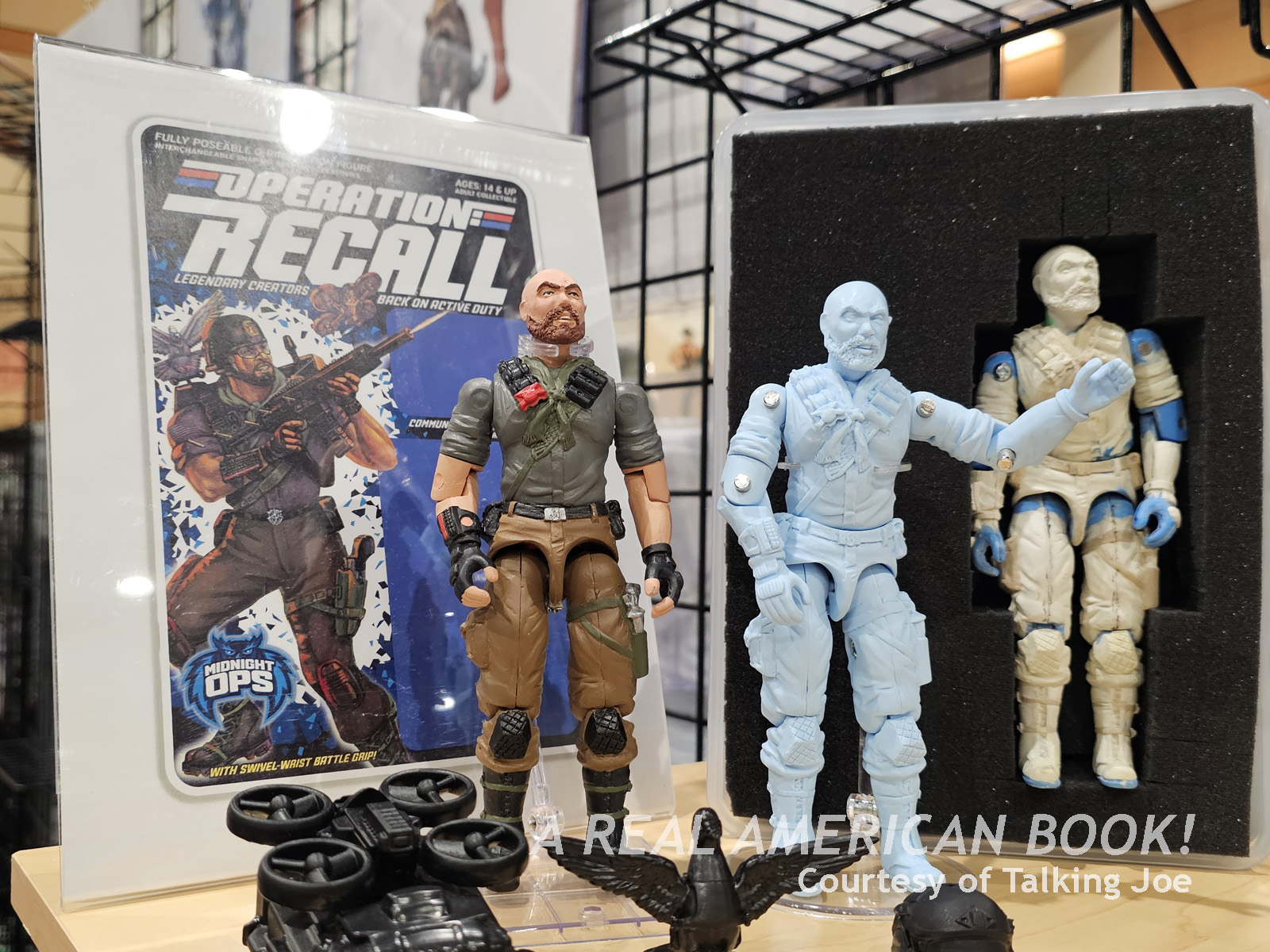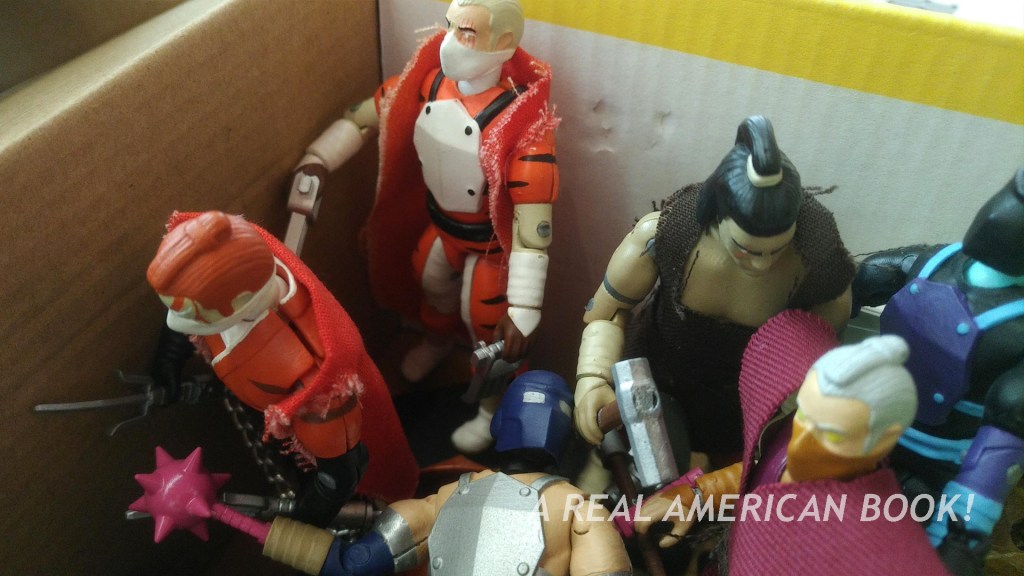 At 6pm the exhibit hall closed for the day. Mark and I met up on our way out, and I realized that the front hallway where you buy your tickets had another five or ten dealer tables! That’s how stuffed JoeFest 2024 was! (JoeFest 2023 had just one.) And cleaning up for the day in that outer area was an impressive quartet: Darren Howlett, Almon Ellis, Matt Smelcher, and Chad Smelcher. I didn’t realize they were the team behind another 3 3/4-inch O-ring line of action figures in an ‘80s G.I. Joe vein, Legends of the Hidden Force.