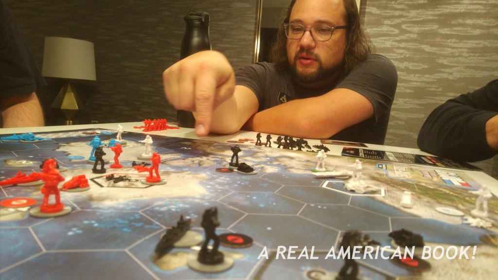 Assembly Required doesn’t start until Friday, but several people arrive early, and perhaps there’s more to do than socialize in the hotel bar. This game session wasn’t on the formal convention schedule, had only coalesced in the days before, and had started as a Facebook post — are there enough people for a game Thursday night? This year it would be G.I. Joe: Battle for the Arctic Circle. It’s a take on Axis & Allies, a game I’ve never played. (But I did play Risk once on a Mac in 1995, does that count?)