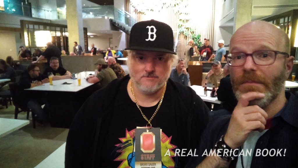 Inside the hotel, up in a deluxe suite, I talked with con organizer and graphic design whiz Brian Sauer while we waited for a few more people to show up. Sauer has had a busy year of design jobs, and spoke of his hopes and expectations for Assembly Required’s attendance. Having Larry Hama as a guest, as well as the 2023-2024 G.I. Joe renaissance (think Classified toys and Skybound comics) was key. I talked about G.I. Joe comics ordering and sales, and my hopes for the Tom Reilly signing at my shop, scheduled for a week later. (I’ll post about that here at the blog after my AR multi-parter is done.) Here’s a photo of us from the next night:
