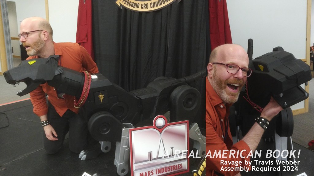Please note the hilarious convention badge that Sauer wears in the photo. Assembly Required 2024 was Destro- and Iron Grenadiers-themed, and the top people not only got a red necklace jewel image for their badge, but a gold chain (referring to Destro’s 1983 costume, of course!) rather than black shoelace thread. This is the kind of detail that separates AR from other shows, and let’s put two and two together here: Brian Sauer is a talented graphic designer, and co-runs the show, and in fact he designed that badge, and all the other badges and signage.