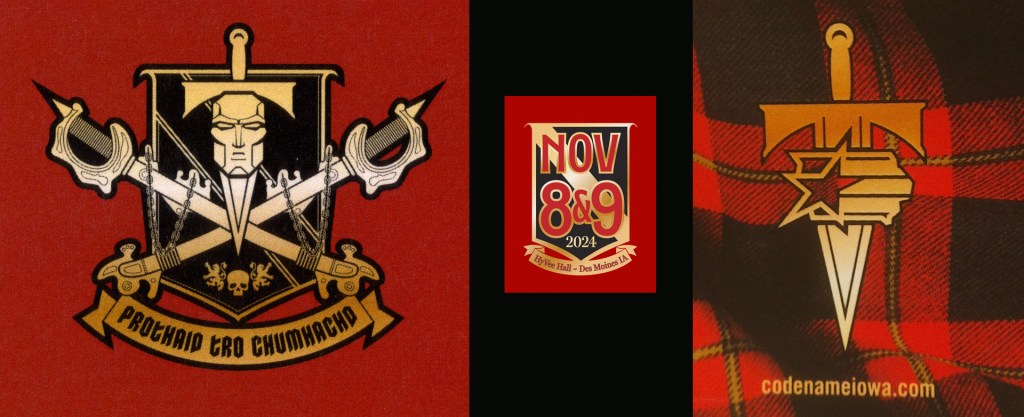 The original Iron Grenadiers logo is a Hasbro invention. (In fact, at the Saturday Declassified panel with Mark Pennington I learned that Pennington himself designed that 1988 logo, with the word “Destro,” a graphical take on Destro’s face, and a downward sword.) But Hasbro, Marvel, Skydance, Paramount, and Skybound didn’t take it a step further and design a coat of arms as far as I can tell. No, above left I believe that’s Brian Sauer, who’s just making his convention program look that much more rad, as an expansion of Pennington’s symbol. And then a banner flourish for the dates on the website, and combining Pennington’s logo with his own Codename: Iowa one (note the shape of the Hawkeye State with the G.I. Joe-ish star-and-stripes) for the back of the program. I don’t even need to mention the plaid, and then there’s the motto — something about money or profit. Sauer is leaving no detail unconsidered. There’s a deeply satisfying level of consistency and care here.