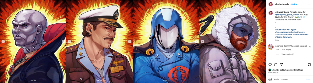 In this tabletop adventure with miniatures and dice, Dellow and I played as Keel-Haul and Snow Job, respectively, with Wolfe and Eggebeen as Cobra Commander and Destro. Each turn has a few steps, like moving, attacking, possibly retreating, and requisitioning. We played two rounds of an abbreviated game (which starts at round 2), didn’t finish (it can go to round 7) and called it a night. It was fun, and I appreciated finally getting to move little battle tokens akin to Risk’s cannons (but now Rattlers, W.O.L.F.s, and Snow Cats) across a board. I also appreciated that this first version of G.I. Joe A&A wasn’t “normal” or temperate, with obvious faves like Duke and Snake-Eyes. Rather, it had the Arctic guy and the aircraft carrier guy, and took place in an exotic location. I’ve always wanted to play physical Risk, and assumed Axis and Allies was about the same, but figured they were too complicated. I’m happy to report that A&A isn’t, or at least it’s not with an expert there to answer every question over and over. And whereas the G.I. Joe Deck-Building Game is chock full of art, Battle for the Arctic Circle is not, with effectively only four pieces of drawn or painted artwork. Those would be the new character cards for Snow-Job, Keel-Haul, and Cobra Commander. Artist Elizabeth Beals did a great job here.