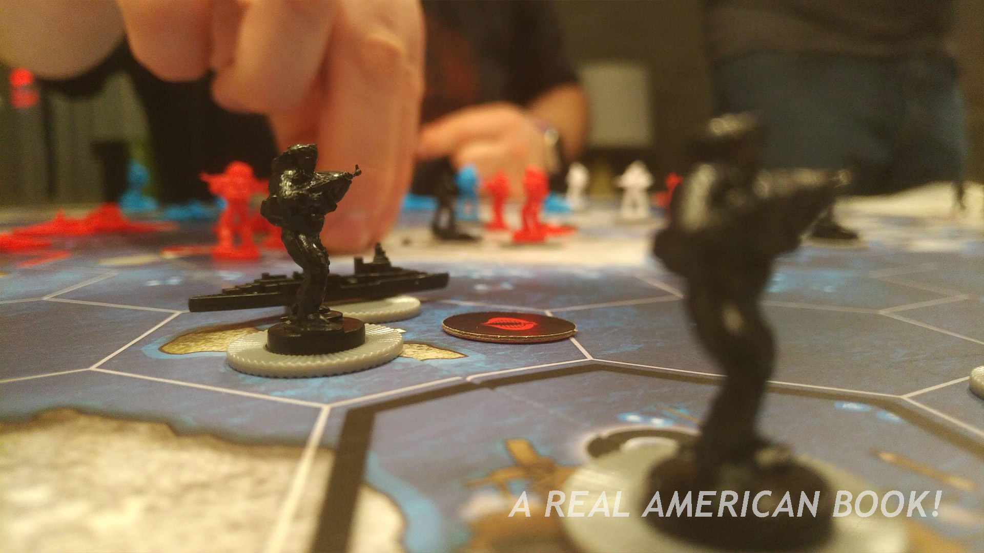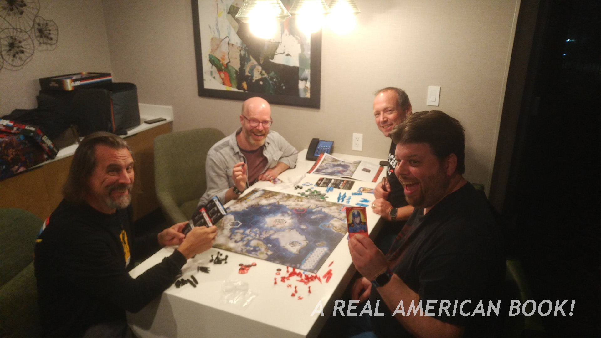 Assembly Required doesn’t start until Friday, but several people arrive early, and perhaps there’s more to do than socialize in the hotel bar. This game session wasn’t on the formal convention schedule, had only coalesced in the days before, and had started as a Facebook post — are there enough people for a game Thursday night? This year it would be G.I. Joe: Battle for the Arctic Circle. It’s a take on Axis & Allies, a game I’ve never played. (But I did play Risk once on a Mac in 1995, does that count?)