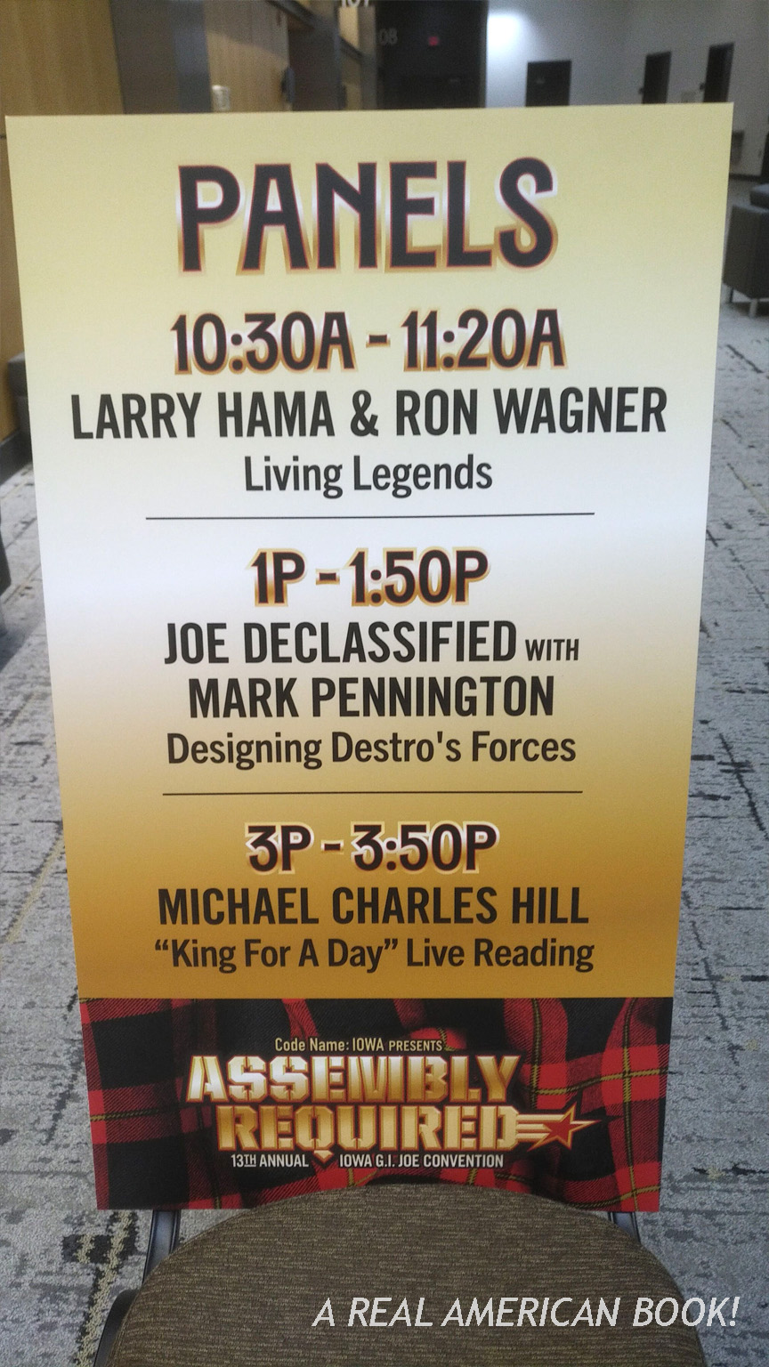 Near the middle of my composite photo is a black box that says “Destro Delivers and So Do We!”, followed by a sentence about ordering shirts and toy bits from the Codename: Iowa website. It’s witty. Destro is an arms dealer, and he sells and delivers weapons and armament. C:I puts on the AR show, and will ship to you fun merch you may have missed. Sauer is clearly having fun with the theme of the convention, and that tracks back to the website and its introductory text: