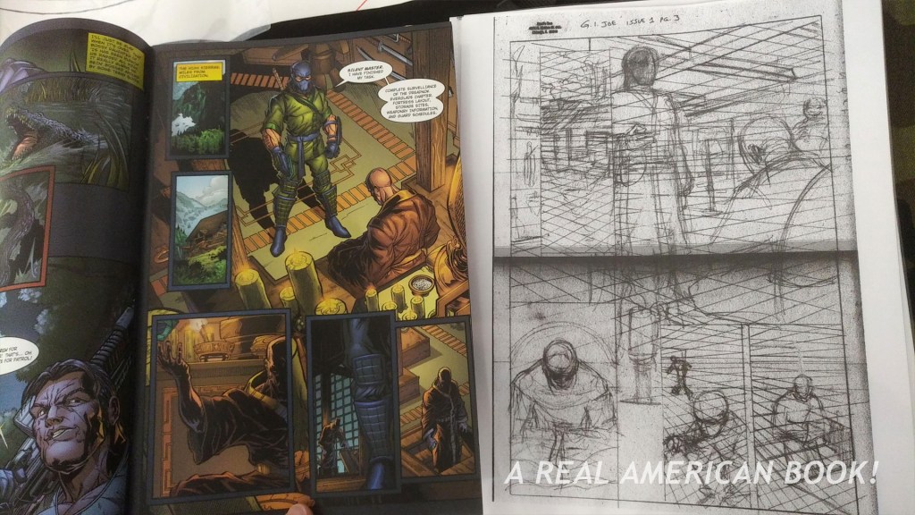 This is fun, a three-ring binder of photocopies of Blaylock’s art layouts for issue #1, with a regular G.I. Joe issue #1 next to it for comparison. Here’s page 2 of the Kurth/Larter final with Blaylock’s roughs of that same page: